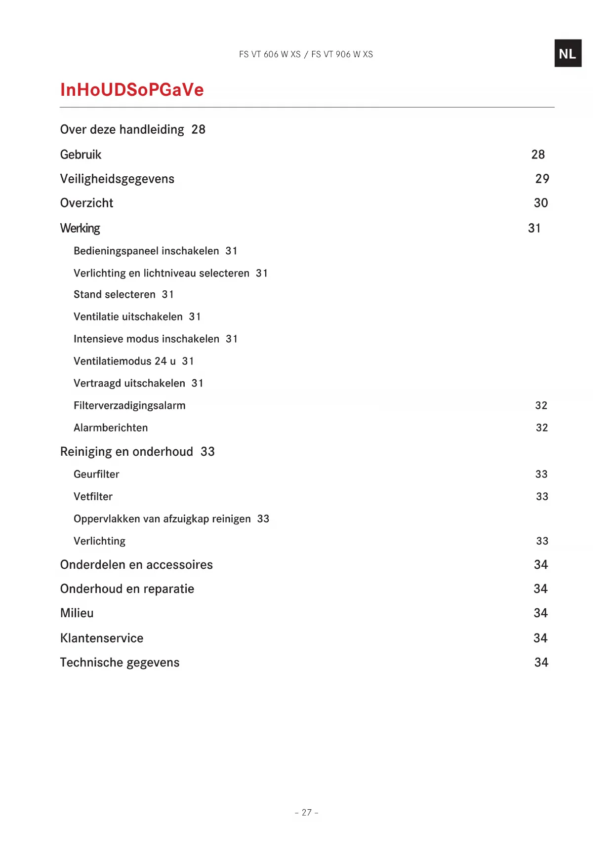 inhoudsopgave Over deze handleiding 28 Gebruik 28 Veiligheidsgegevens 29 Overzicht 30 Werking 31 Bedieningspaneel inschakelen 31 Verlichting en lichtniveau selecteren 31 Stand selecteren 31 Ventilatie uitschakelen 31 Intensieve modus inschakelen 31 Ventilatiemodus 24 u 31 Vertraagd uitschakelen 31 Filterverzadigingsalarm 32 Alarmberichten 32 Reiniging en onderhoud 33 Geurfilter 33 Vetfilter 33 Oppervlakken van afzuigkap reinigen 33 Verlichting 33 Onderdelen en accessoires 34 Onderhoud en reparatie 34 Milieu 34 Klantenservice 34 Technische gegevens 34FS VT 606 W XS / FS VT 906 W XS – 28 –