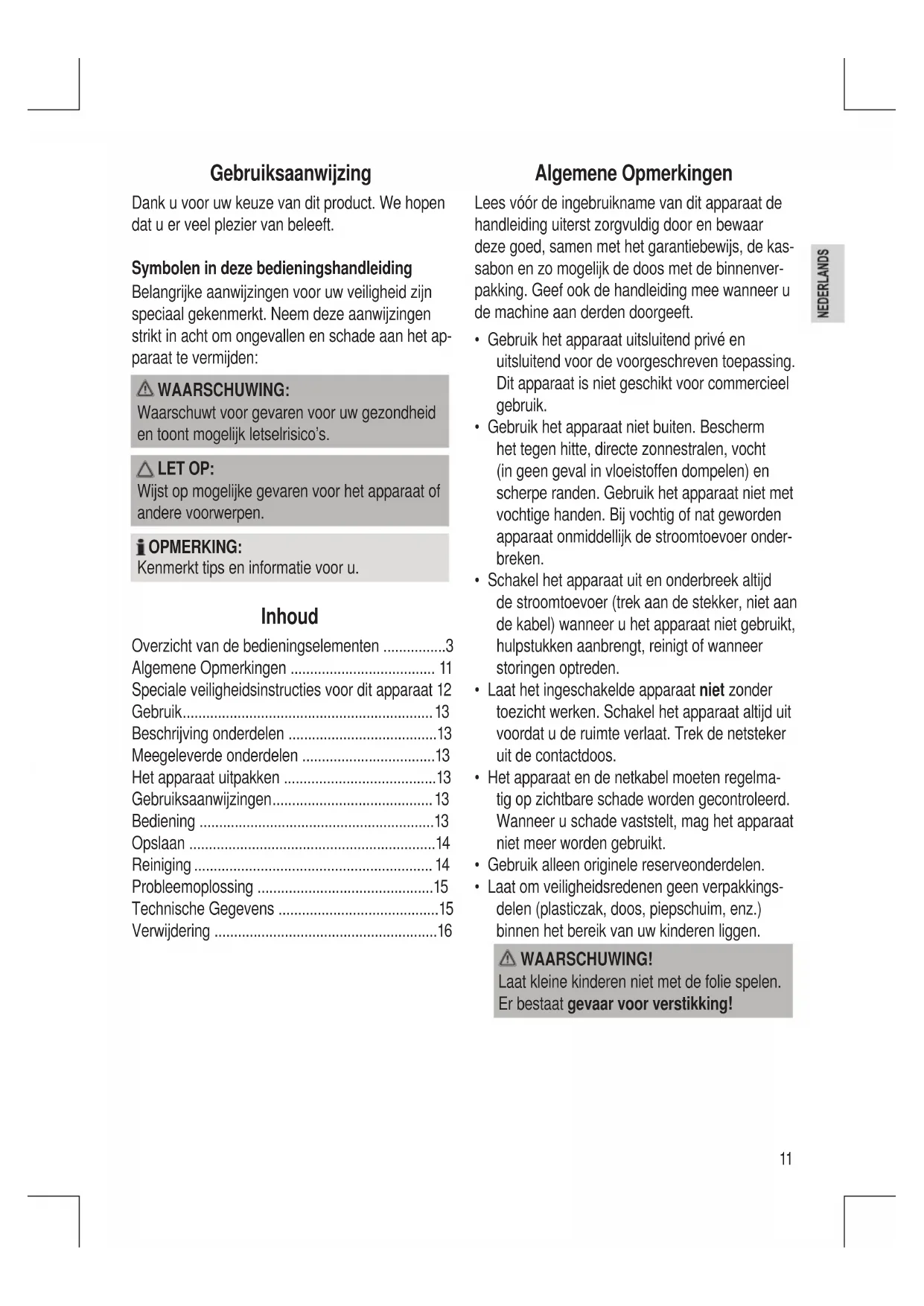 Lees vór de ingebruikname van dit apparaat de handleiding uiterst zorgvuldig door en bewaar deze goed, samen met het garantiebewijs, de kassabon en zo möglichk de doos met de binnenverpakking. Geef ook de handleiding mee wanner u de machine aan derden doorgeeft.
