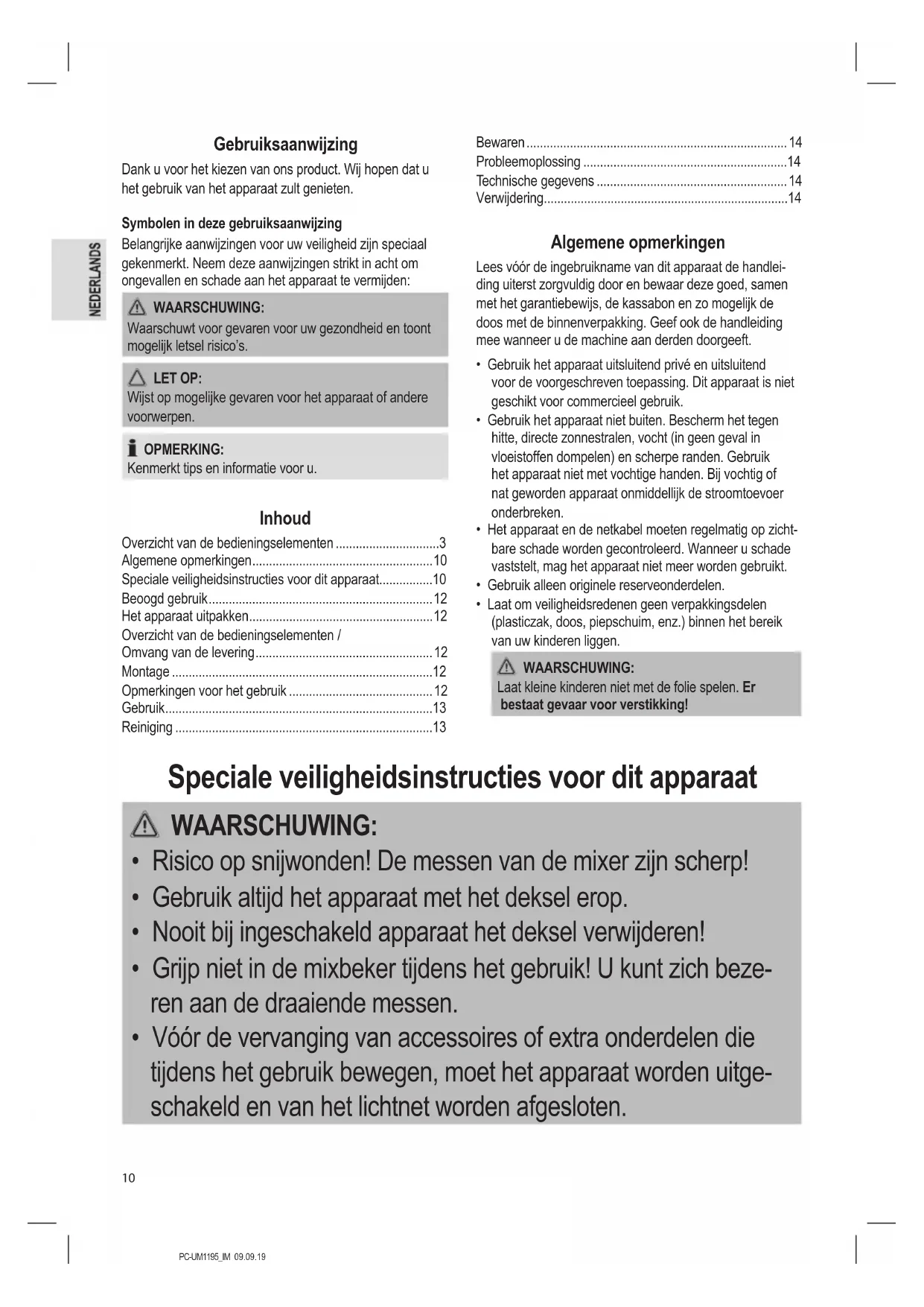 - Speciale veiligheidsinstructies voor dit apparaat p. 10
