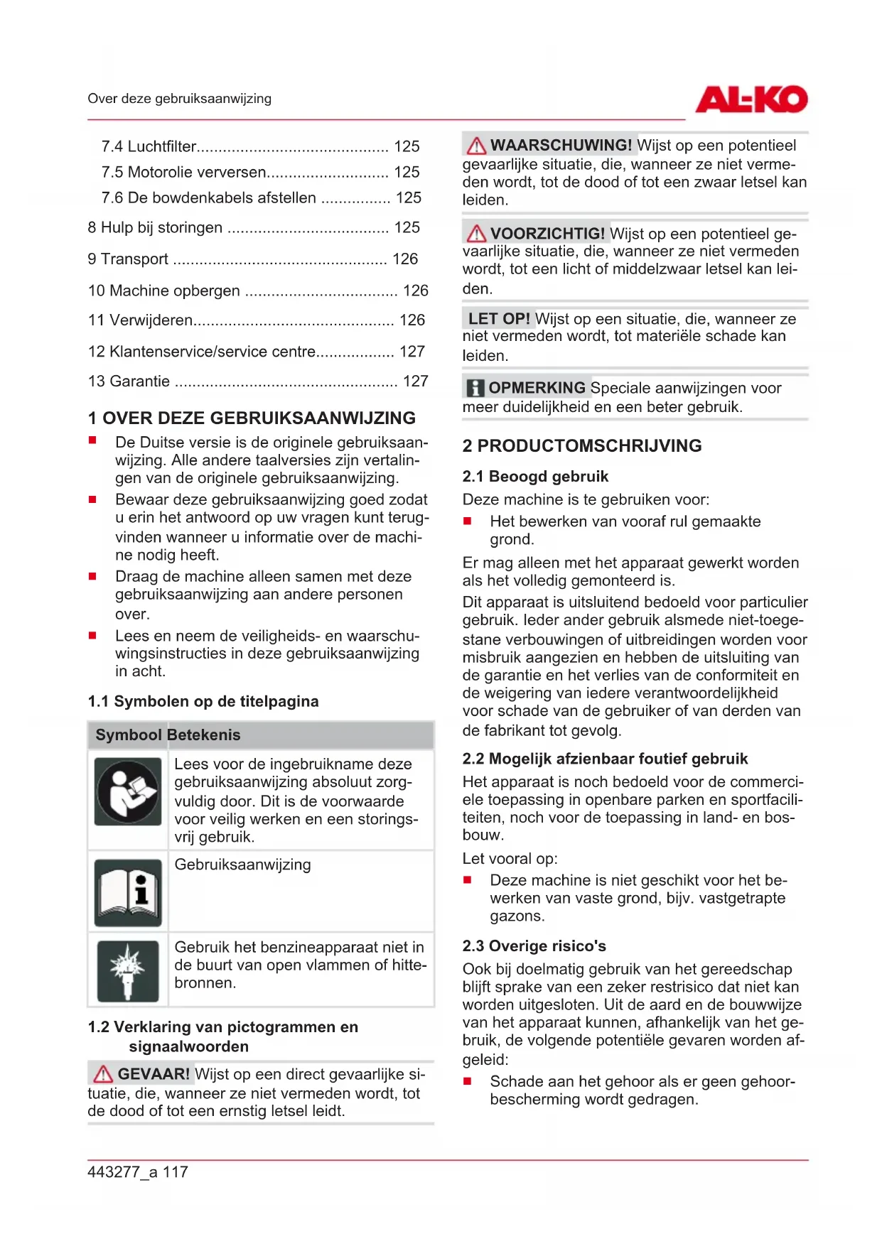 Het productoverzicht (01, 09, 18) geeft een over- zicht van de machine. Nr. Onderdeel 1 Koppelingshendel 2 Duwboom 3 Versnellingshendel 4 Motor 5 Wiel 6 Hakmessen 7 Bescherming platen 8 Afschermkap443277_a 119 Veiligheidsinstructies Nr. Onderdeel 9 Remspoor 10 Gashendel 11 Hendel voor achteruitversnelling 12 Motorschakelaar 3 VEILIGHEIDSINSTRUCTIES GEVAAR! Levensgevaar en gevaar voor zeer ernstig letsel! Onbekendheid met de veilig- heidsinstructies en bedieningsinstructies kan bij- zonder ernstig letsel en zelfs de dood tot gevolg hebben.