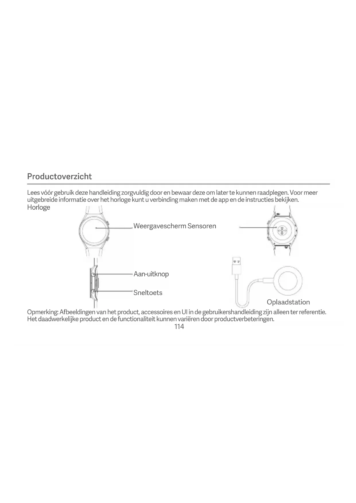 Plaats de stroomadapter, het oplaadstation en het horloge in een droge omgeving tijdens het opladen. Raak de stroomadapter en het oplaadstation niet aan met nae handen. De stroomadapter, het oplaadstation en het horloge mogen niet worden blootgesteld aan regen of andere vloeistof. De werktemperatuur van het horloge is 0°C tot 45°C. Als de omgevingstemperatuur te hoog of te laag is, zal het horloge niet correct werken. Het horloge hee een ingebouwde baerij. Om schade aan de baerij of het horloge te vermijden, mag u de baerij niet zelf demonteren of vervangen. Alleen erkende dienstverleners mogen de baerij vervangen; anders kan dit gevaar veroorzaken, zelfs persoonlijk letsel als een verkeerd baerijtype wordt gebruikt. U mag het horloge niet demonteren, erop slaan, samenpersen of in een vuur gooien. Staak het gebruik van de baerij onmiddellijk als u zwellingen of vloeistoflekken ontdekt. Gooi het horloge of haar baerij nooit in het vuur om een explosie te vermijden. Dit horloge is geen medisch hulpmiddel. Gegevens of informatie die door het horloge worden verstrekt, mogen niet worden gebruikt al basis voor diagnose, behandeling en preventie van ziektes. Het horloge en haar accessoires kunnen kleine deeltjes bevaen. Om verstikking of andere gevaren of schade veroorzaakt door kinderen te vermijden, moet u het horloge buiten het bereik van kinderen houden. Het horloge is geen speelgoed. Houd het buiten het bereik van kinderen.
