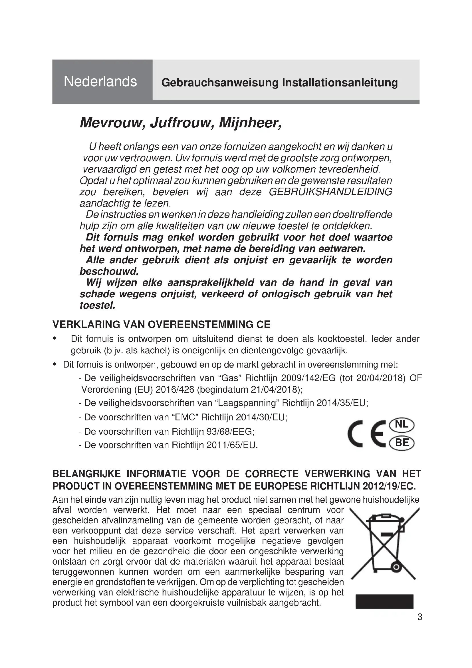 - Dit fornuis is ontworpen, gebouwd en op de markt gebracht in overeenstemming met: - De veiligheidsvoorschriften van “Gas” Richtlijn 2009/142/EG (tot 20/04/2018) OF Verordening (EU) 2016/426 (begindatum 21/04/2018); - De veiligheidsvoorschriften van “Laagspanning” Richtlijn 2014/35/EU; - De voorschriften van “EMC” Richtlijn 2014/30/EU; - De voorschriften van Richtlijn 93/68/EEG; - De voorschriften van Richtlijn 2011/65/EU.4
