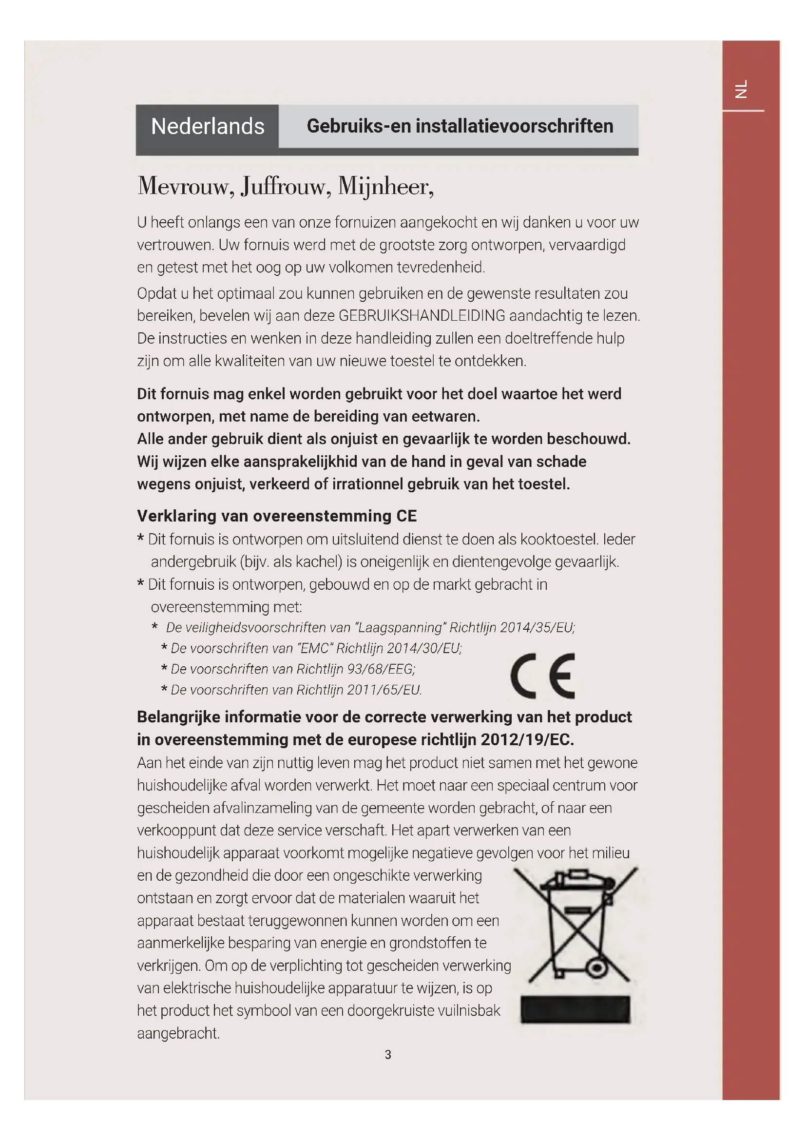 - Dit fornuis is ontworpen om uitsluitend Dienst te doen als kooktoestel. Ieder andergebruik (bijv. als kachel) is oneigenlijk en dientengevolge gevaarlijk.