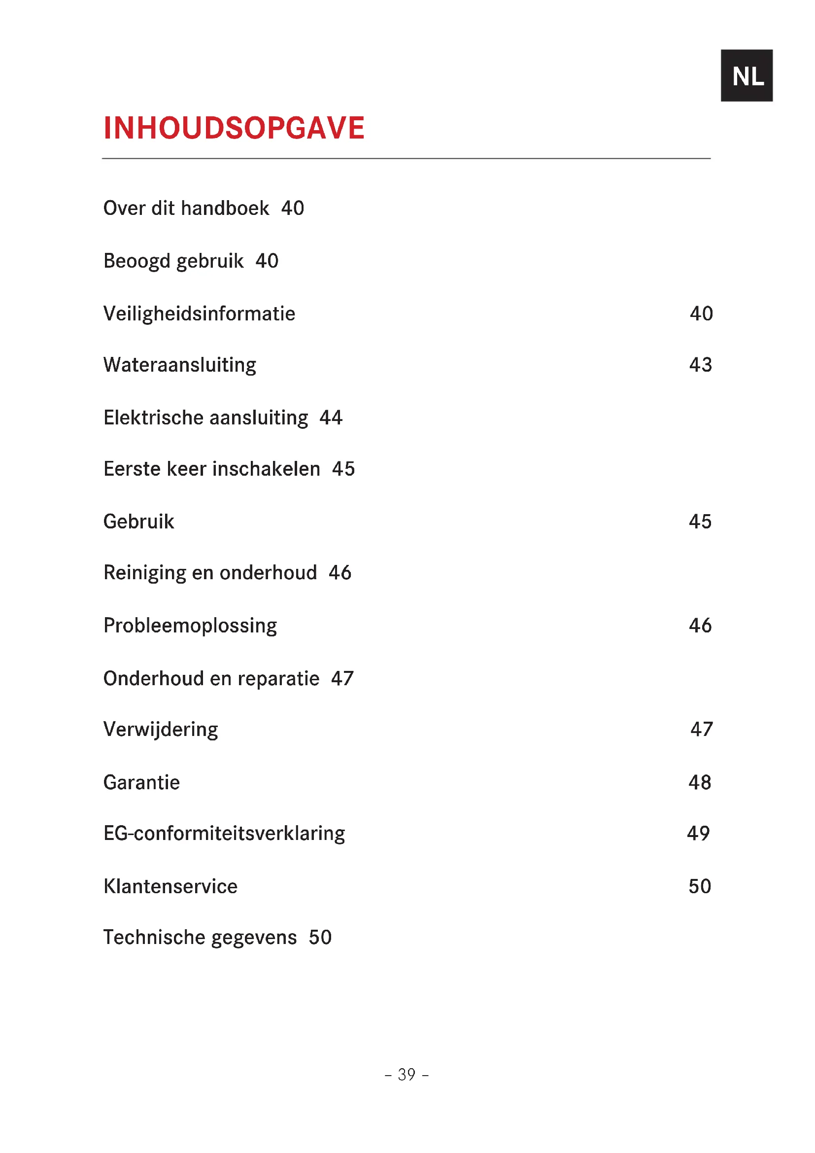 INHOUDSOPGAVE Over dit handboek 40 Beoogd gebruik 40 Veiligheidsinformatie 40 Wateraansluiting 43 Elektrische aansluiting 44 Eerste keer inschakelen 45 Gebruik 45 Reiniging en onderhoud 46 Probleemoplossing 46 Onderhoud en reparatie 47 Verwijdering 47 Garantie 48 EG-conformiteitsverklaring 49 Klantenservice 50 Technische gegevens 50– 40 –