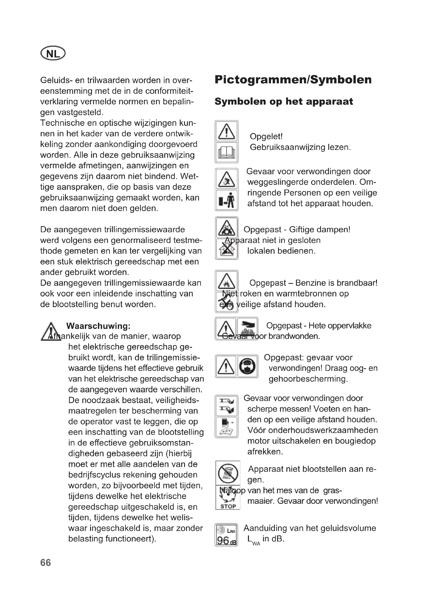 Geluids-entrilwaardenwordeninover- eenstemming met de in de conformiteit- verklaringvermeldenormenenbepalin- gen vastgesteld. Technischeenoptischewijzigingenkun- neninhetkadervandeverdereontwik- kelingzonderaankondigingdoorgevoerd worden.Alleindezegebruiksaanwijzing vermeldeafmetingen,aanwijzingenen gegevenszijndaaromnietbindend.Wet- tigeaanspraken,dieopbasisvandeze gebruiksaanwijzinggemaaktworden,kan men daarom niet doen gelden. Deaangegeventrillingemissiewaarde werdvolgenseengenormaliseerdtestme- thodegemetenenkantervergelijkingvan eenstukelektrischgereedschapmeteen andergebruiktworden. Deaangegeventrillingemissiewaardekan ookvooreeninleidendeinschattingvan deblootstellingbenutworden. Waarschuwing: Afhankelijkvandemanier,waarop hetelektrischegereedschapge- bruiktwordt,kandetrilingemissie- waardetijdensheteectievegebruik vanhetelektrischegereedschapvan deaangegevenwaardeverschillen. Denoodzaakbestaat,veiligheids- maatregelen ter bescherming van deoperatorvastteleggen,dieop een inschatting van de blootstelling indeeectievegebruiksomstan- dighedengebaseerdzijn(hierbij moet er met alle aandelen van de bedrijfscyclusrekeninggehouden worden,zobijvoorbeeldmettijden, tijdensdewelkehetelektrische gereedschapuitgeschakeldis,en tijden,tijdensdewelkehetwelis- waaringeschakeldis,maarzonder belastingfunctioneert). Pictogrammen/Symbolen Symbolen op het apparaat Opgelet! Gebruiksaanwijzinglezen. Gevaarvoorverwondingendoor weggeslingerdeonderdelen.Om- ringendePersonenopeenveilige afstandtothetapparaathouden. Opgepast-Giftigedampen! Apparaatnietingesloten lokalenbedienen. Opgepast–Benzineisbrandbaar! Nietrokenenwarmtebronnenop een veilige afstand houden. Opgepast-Heteoppervlakke Gevaarvoorbrandwonden. Opgepast:gevaarvoor verwondingen! Draag oog- en gehoorbescherming. Gevaarvoorverwondingendoor scherpemessen!Voetenenhan- denopeenveiligeafstandhouden. Vóóronderhoudswerkzaamheden motoruitschakelenenbougiedop afrekken. Apparaatnietblootstellenaanre- gen. Naloopvanhetmesvandegras- maaier. Gevaardoorverwondingen!