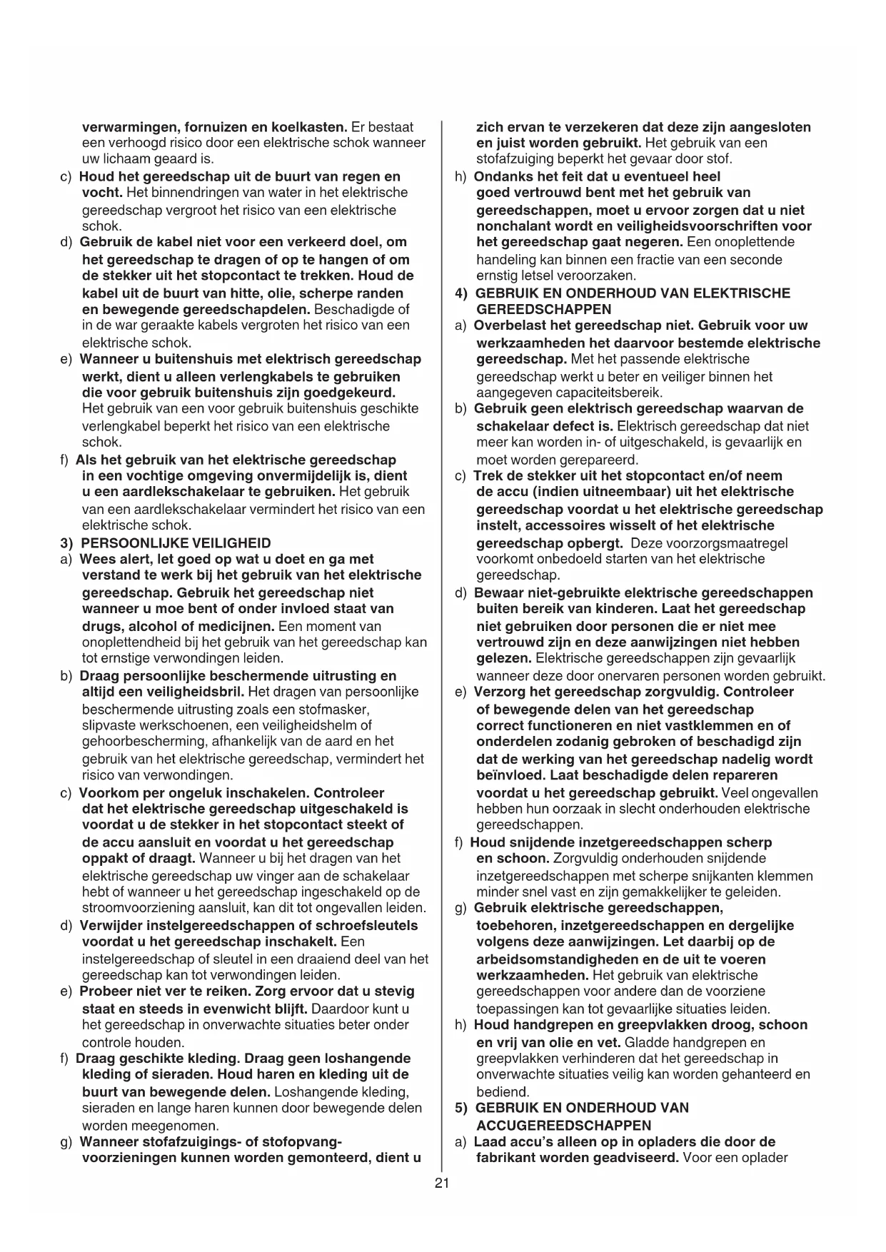 ACCUGEREEDSCHAPPEN a) Laad accu’s alleen op in opladers die door de fabrikant worden geadviseerd. Voor een oplader verwarmingen, fornuizen en koelkasten. Er bestaat een verhoogd risico door een elektrische schok wanneer uw lichaam geaard is. c) Houd het gereedschap uit de buurt van regen en vocht. Het binnendringen van water in het elektrische gereedschap vergroot het risico van een elektrische schok. d) Gebruik de kabel niet voor een verkeerd doel, om het gereedschap te dragen of op te hangen of om de stekker uit het stopcontact te trekken. Houd de kabel uit de buurt van hitte, olie, scherpe randen en bewegende gereedschapdelen. Beschadigde of in de war geraakte kabels vergroten het risico van een elektrische schok. e) Wanneer u buitenshuis met elektrisch gereedschap werkt, dient u alleen verlengkabels te gebruiken die voor gebruik buitenshuis zijn goedgekeurd. Het gebruik van een voor gebruik buitenshuis geschikte verlengkabel beperkt het risico van een elektrische schok. f) Als het gebruik van het elektrische gereedschap in een vochtige omgeving onvermijdelijk is, dient u een aardlekschakelaar te gebruiken. Het gebruik van een aardlekschakelaar vermindert het risico van een elektrische schok.
