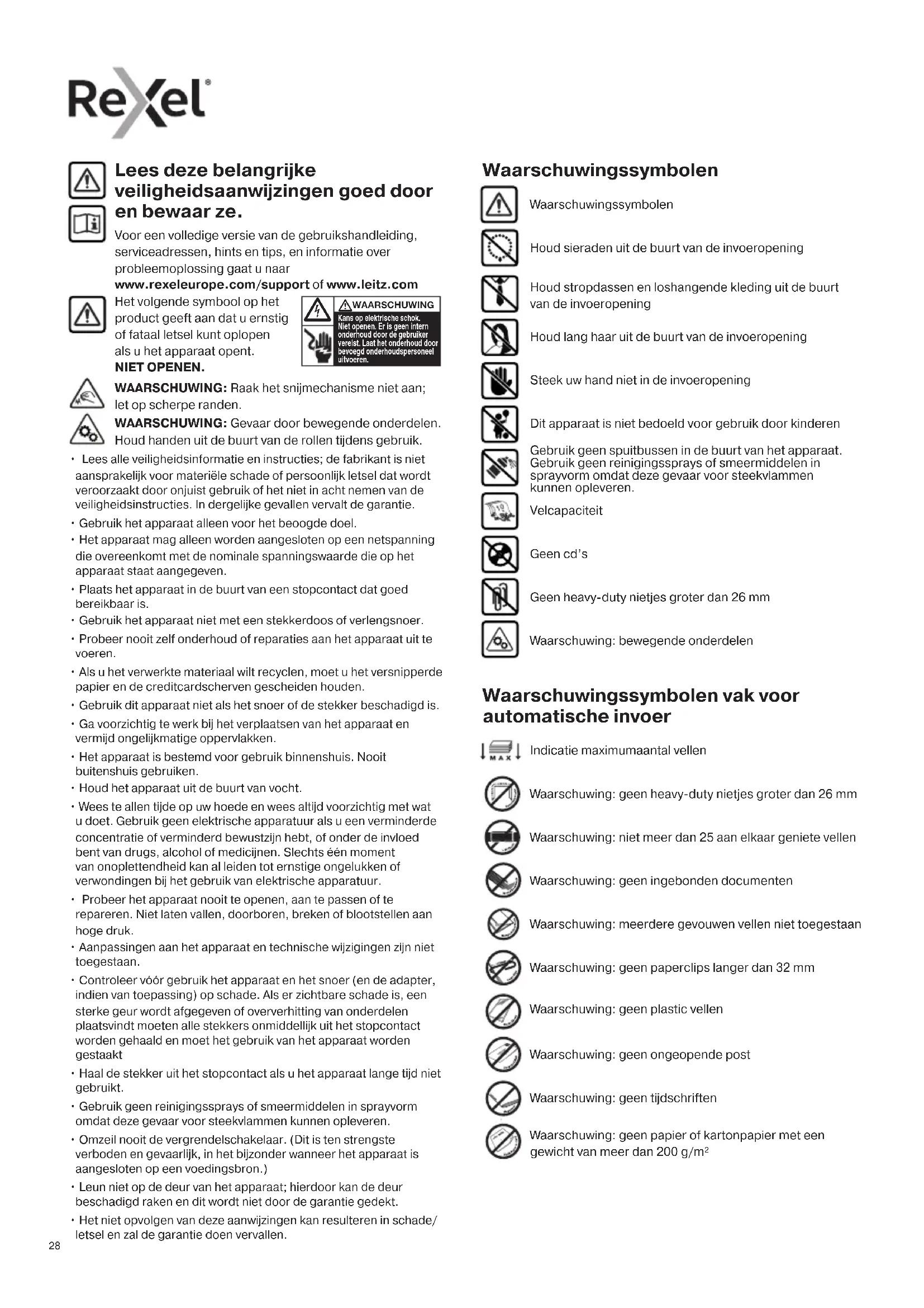 - Het niet opvolgen van deze aanwijzingen kan resulteren in schade/ letsel en zal de garantie doen vervallen. Lees deze belangrijke veiligheidsaanwijzingen goed door en bewaar ze. Voor een volledige versie van de gebruikshandleiding, serviceadressen, hints en tips, en informatie over probleemoplossing gaat u naar www.rexeleurope.com/support of www.leitz.com Houd sieraden uit de buurt van de invoeropening Houd stropdassen en loshangende kleding uit de buurt van de invoeropening Waarschuwingssymbolen Houd lang haar uit de buurt van de invoeropening Steek uw hand niet in de invoeropening Waarschuwingssymbolen Velcapaciteit Geen cd’s Geen heavy-duty nietjes groter dan 26 mm Waarschuwing: bewegende onderdelen WAARSCHUWING: Raak het snijmechanisme niet aan; let op scherpe randen. WAARSCHUWING: Gevaar door bewegende onderdelen. Houd handen uit de buurt van de rollen tijdens gebruik. Dit apparaat is niet bedoeld voor gebruik door kinderen Gebruik geen spuitbussen in de buurt van het apparaat. Gebruik geen reinigingssprays of smeermiddelen in sprayvorm omdat deze gevaar voor steekvlammen kunnen opleveren. Waarschuwing: geen heavy-duty nietjes groter dan 26 mm Waarschuwing: geen ingebonden documenten Waarschuwing: niet meer dan 25 aan elkaar geniete vellen Waarschuwingssymbolen vak voor automatische invoer Waarschuwing: meerdere gevouwen vellen niet toegestaan Waarschuwing: geen paperclips langer dan 32 mm Indicatie maximumaantal vellen Waarschuwing: geen tijdschriften Waarschuwing: geen papier of kartonpapier met een gewicht van meer dan 200 g/m² Waarschuwing: geen plastic vellen Waarschuwing: geen ongeopende post2929292929 Icoon Type Modellen Knop/indicator en handeling Knop voor automatisch starten en stand-by (eenmaal drukken) Knop voor handmatige terugloopfunctie (ingedrukt houden) Knop voor handmatige vooruitfunctie (ingedrukt houden) Gereed-indicator Oververhittingsindicator (papiervernietiger laten afkoelen) Indicator te veel papier/ papierstoring (vellen papier verwijderen/papierstoring verhelpen) Indicator opvangbak vol (deur openen en opvangbak leegmaken; 45X: kop met snijmechanisme van apparaat tillen en opvangbak leegmaken) Indicator deur open/kop met snijmechanisme verwijderd (deur goed sluiten/kop goed op opvangbak plaatsen) Indicator laaddeur vergrendeld (combinatie van vier cijfers invoeren om deur te ontgrendelen) Laaddeur vergrendelen, knop 1 voor cijfercombinatie Laaddeur vergrendelen, knop 2 voor cijfercombinatie Laaddeur vergrendelen, knop 3 voor cijfercombinatie Laaddeur vergrendelen, knop 4 voor cijfercombinatie Bediening