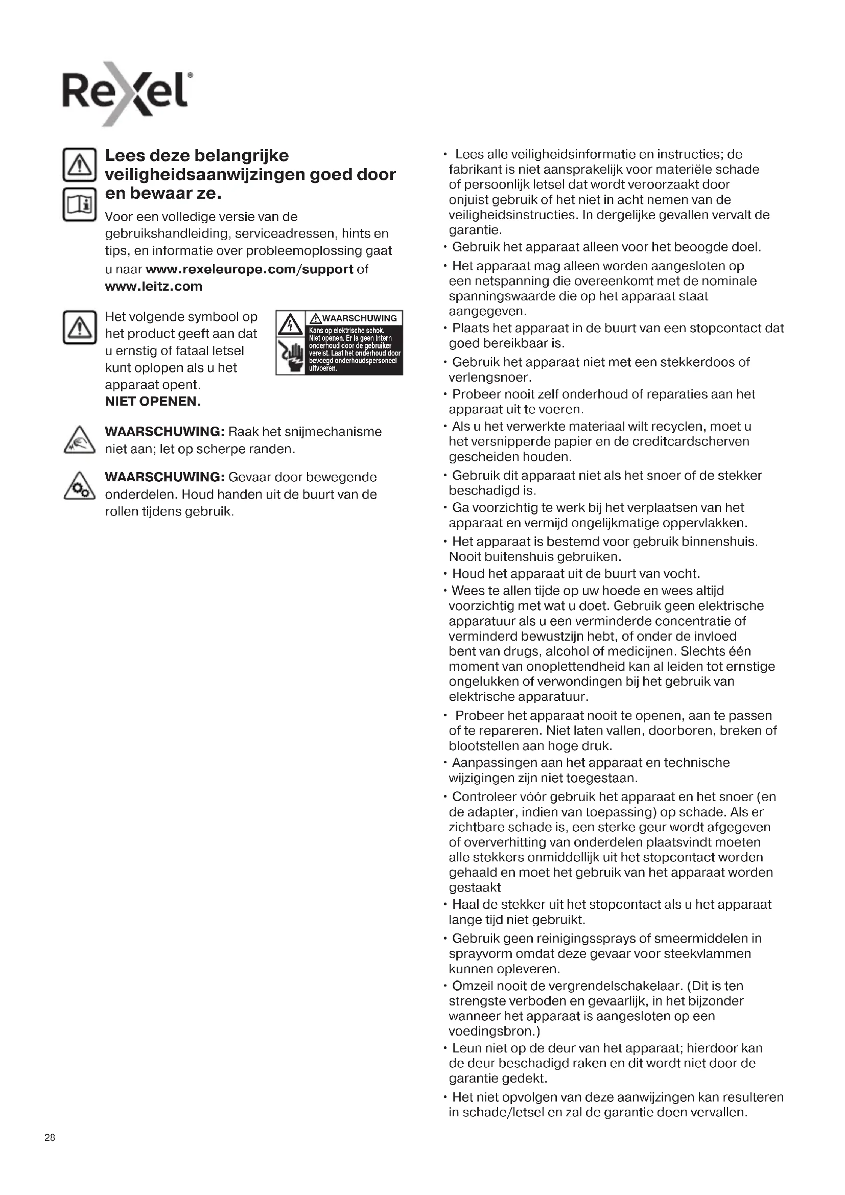 - Het niet opvolgen van deze aanwijzingen kan resulteren in schade/letsel en zal de garantie doen vervallen. Lees deze belangrijke veiligheidsaanwijzingen goed door en bewaar ze. Voor een volledige versie van de gebruikshandleiding, serviceadressen, hints en tips, en informatie over probleemoplossing gaat u naar www.rexeleurope.com/support of www.leitz.com WAARSCHUWING: Raak het snijmechanisme niet aan; let op scherpe randen. WAARSCHUWING: Gevaar door bewegende onderdelen. Houd handen uit de buurt van de rollen tijdens gebruik.2929292929 Houd sieraden uit de buurt van de invoeropening Houd stropdassen en loshangende kleding uit de buurt van de invoeropening Waarschuwingssymbolen Houd lang haar uit de buurt van de invoeropening Steek uw hand niet in de invoeropening Waarschuwingssymbolen Velcapaciteit Geen cd’s Geen heavy-duty nietjes groter dan 26 mm Waarschuwing: bewegende onderdelen Dit apparaat is niet bedoeld voor gebruik door kinderen Gebruik geen spuitbussen in de buurt van het apparaat. Gebruik geen reinigingssprays of smeermiddelen in sprayvorm omdat deze gevaar voor steekvlammen kunnen opleveren. Icoon Type Button / indication & action Bedieningsknoppen Knop voor automatisch starten en stand-by (eenmaal drukken) Terugloopfunctie (snijmechanisme werkt in achterwaartse richting) Vooruit (snijmechanisme werkt in voorwaartse richting) Oververhittingsindicator (papiervernietiger laten afkoelen) Indicator te veel papier/ papierstoring (vellen papier verwijderen/ papierstoring verhelpen) Modellen met drukknoppen Icoon Type Schuifknop/indicator en handeling Schuifknop Automatisch starten (versnipperen wordt automatisch gestart) Terugloopfunctie (snijmechanisme werkt in achterwaartse richting) Vooruit (snijmechanisme werkt in voorwaartse richting) Statusindicatoren Uit (papiervernietiger wordt uitgeschakeld) Gereed-indicator (kop met snijmechanisme op opvangbak en schuifknop in stand voor automatisch starten) Oververhittingsindicator (papiervernietiger laten afkoelen) Knoppen en indicatoren Modellen met schuifknop Geen creditcards Accessoires Gebruik alleen Rexel-accessoires: Smeervellen (20) - 2101949 Smeervellen (12) - 210194830 Dik papier of karton met een maximale dikte van 200 g/m². Meerdere gevouwen vellen (dubbelgevouwen A3-vellen). Glanzend papier of een vel dat aan beide zijden is bedrukt. Cd’s en dvd’s Gebruik geen spuitbussen Geen olie, alleen olievellen Versnipperingscapaciteit KAN het volgende versnipperen: