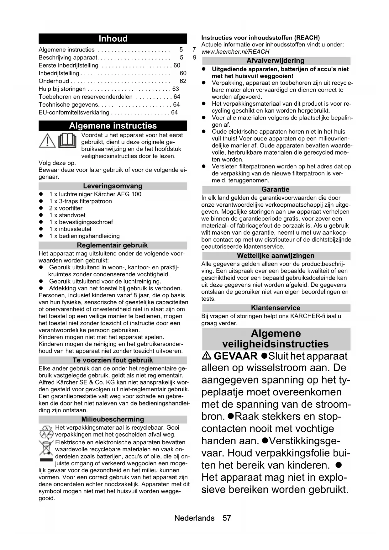 - dB(A) 37 - 65 Peso kg 13 Altura mm 1120 Diâmetro da placa de pés mm 320 Temperatura ambiente °C 10 - 30 Humidade relativa do ar % 20 - 80 Chairman of the Board of ManagementDirector Regulatory Affairs & Certification H. Jenner S. ReiserNederlands 57 Inhoud Algemene instructies Voordat u het apparaat voor het eerst gebruikt, dient u deze originele ge- bruiksaanwijzing en de het hoofdstuk veiligheidsinstructies door te lezen. Volg deze op. Bewaar deze voor later gebruik of voor de volgende ei- genaar. Leveringsomvang 1 x luchtreiniger Kärcher AFG 100 1 x 3-traps filterpatroon 2 x voorfilter 1 x standvoet 1 x bevestigingsschroef 1 x inbussleutel 1 x bedieningshandleiding Reglementair gebruik Het apparaat mag uitsluitend onder de volgende voor- waarden worden gebruikt: Gebruik uitsluitend in woon-, kantoor- en praktij- kruimtes zonder condenserende vochtigheid. Gebruik uitsluitend voor de luchtreiniging. Afdekking van het toestel bij gebruik is verboden. Personen, inclusief kinderen vanaf 8 jaar, die op basis van hun fysieke, sensorische of geestelijke capaciteiten of onervarenheid of onwetendheid niet in staat zijn om het toestel op een veilige manier te bedienen, mogen het toestel niet zonder toezicht of instructie door een verantwoordelijke persoon gebruiken. Kinderen mogen niet met het apparaat spelen. Kinderen mogen de reiniging en het gebruikersonder- houd van het apparaat niet zonder toezicht uitvoeren. Te voorzien fout gebruik Elke ander gebruik dan de onder het reglementaire ge- bruik vastgelegde gebruik, geldt als niet reglementair. Alfred Kärcher SE & Co. KG kan niet aansprakelijk wor- den gesteld voor gevolgen uit niet-reglementair gebruik. Een garantieprestatie valt weg voor schade en gebre- ken die door het niet naleven van de bedieningshandlei- ding zijn ontstaan. Milieubescherming Het verpakkingsmateriaal is recyclebaar. Gooi verpakkingen met het gescheiden afval weg. Elektrische en elektronische apparaten bevatten waardevolle recyclebare materialen en vaak on- derdelen zoals batterijen, accu's of olie, die bij on- juiste omgang of verkeerd weggooien een moge- lijk gevaar voor de gezondheid en het milieu kunnen vormen. Voor een correct gebruik van het apparaat zijn deze onderdelen echter noodzakelijk. Apparaten met dit symbool mogen niet met het huisvuil worden wegge- gooid. Instructies voor inhoudsstoffen (REACH) Actuele informatie over inhoudsstoffen vindt u onder: www.kaercher.nl/REACH Afvalverwijdering Uitgediende apparaten, batterijen of accu’s niet met het huisvuil weggooien! Verpakking, apparaat en toebehoren zijn uit recycle- bare materialen vervaardigd en dienen correct te worden afgevoerd. Het verpakkingsmateriaal van dit product is voor re- cycling geschikt en kan worden hergebruikt. Voer alle materialen volgens de plaatselijke bepalin- gen af. Oude elektrische apparaten horen niet in het huis- vuil thuis! Voer oude apparaten op een milieuvrien- delijke manier af. Oude apparaten bevatten waarde- volle, herbruikbare materialen die gerecycled moe- ten worden. Versleten filterpatronen worden op het adres dat op de verpakking van de nieuwe filterpatroon is ver- meld, teruggenomen. Garantie In elk land gelden de garantievoorwaarden die door onze verantwoordelijke verkoopmaatschappij zijn uitge- geven. Mogelijke storingen aan uw apparaat verhelpen we binnen de garantieperiode gratis, voor zover een materiaal- of fabricagefout de oorzaak is. Als u gebruik wilt maken van de garantie, neemt u met uw aankoop- bon contact op met uw distributeur of de dichtstbijzijnde geautoriseerde klantenservice. Wettelijke aanwijzingen Alle gegevens gelden alleen voor de productbeschrij- ving. Een uitspraak over een bepaalde kwaliteit of een geschiktheid voor een bepaald gebruiksdoeleinde kan uit deze gegevens niet worden afgeleid. De gegevens ontslaan de gebruiker niet van eigen beoordelingen en tests. Klantenservice Bij vragen of storingen helpt ons KÄRCHER-filiaal u graag verder. Algemene veiligheidsinstructies GEVAAR Sluit het apparaat alleen op wisselstroom aan. De aangegeven spanning op het ty- peplaatje moet overeenkomen met de spanning van de stroom- bron. Raak stekkers en stop- contacten nooit met vochtige handen aan. Verstikkingsge- vaar. Houd verpakkingsfolie bui- ten het bereik van kinderen. Het apparaat mag niet in explo- sieve bereiken worden gebruikt. Algemene instructies p. 57