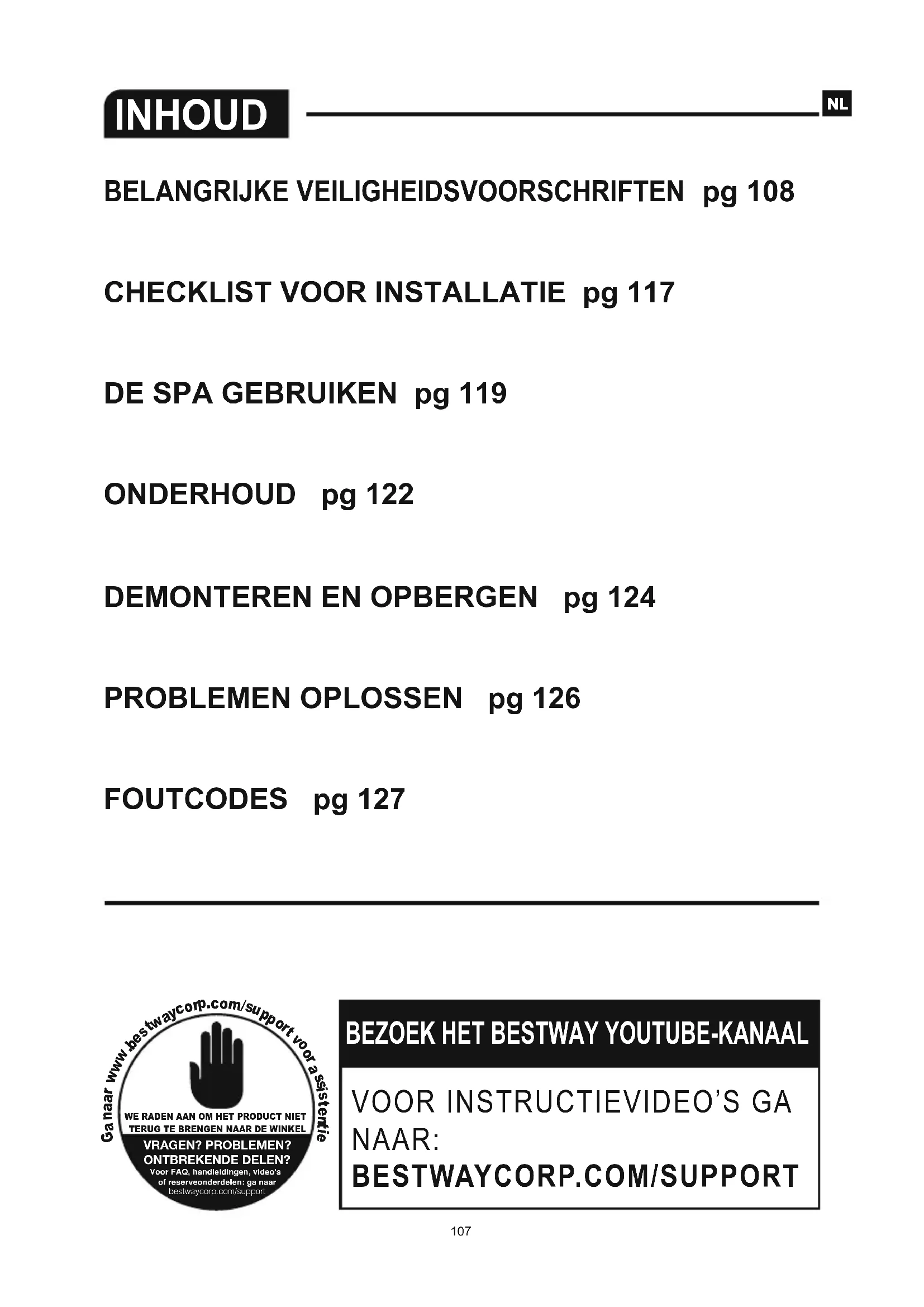 P61727ASS18P61726ASS18P05344P61726ASS18Problemen Mogelijke oorzaken Oplossingen PROBLEEMOPLOSSING Bestway streeft ernaar de meest probleemloze spa's op de markt te brengen. Als u problemen ondervindt, aarzel dan niet om contact op te nemen met Bestway of met uw geautoriseerde dealer. Hier zijn enkele nuttige tips om u te helpen enkele vaak voorkomende oorzaken van problemen te identificeren en op te lossen.