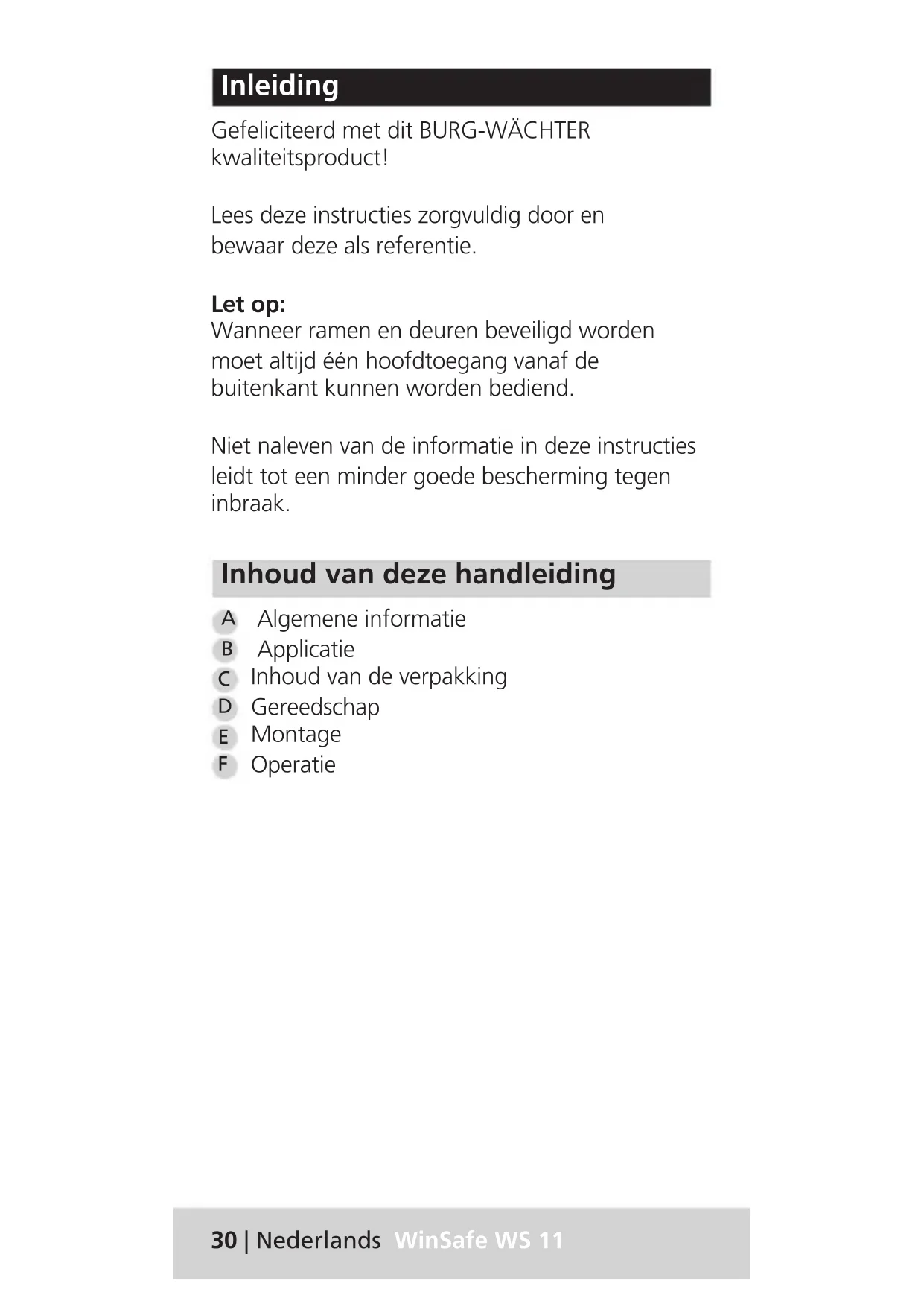 La èche montre le cadenas ouvert : Le verrou de fenêtre est déverrouillé. Dans cette position le levier pivotant peut être mis en en position d’arrêt. La sécurité pour fenêtre n‘est pas verrouillé.30 | Nederlands WinSafe WS 11 Inleiding Gefeliciteerd met dit BURG-WÄCHTER kwaliteitsproduct! Lees deze instructies zorgvuldig door en bewaar deze als referentie. Let op: Wanneer ramen en deuren beveiligd worden moet altijd één hoofdtoegang vanaf de buitenkant kunnen worden bediend. Niet naleven van de informatie in deze instructies leidt tot een minder goede bescherming tegen inbraak. Inhoud van deze handleiding