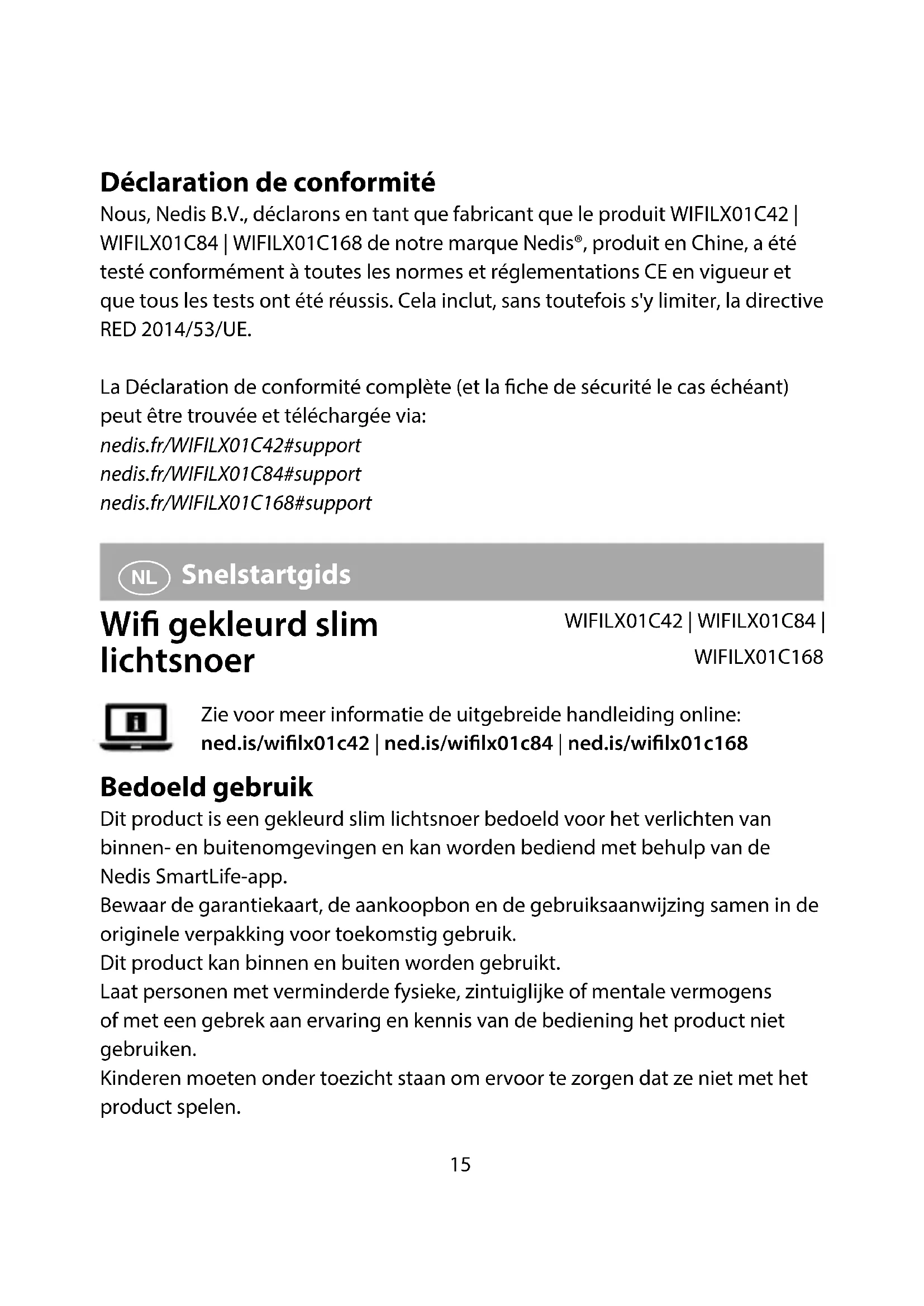 Verklaring van overeenstemming Wij, Nedis B.V. verklaren als fabrikant dat het product WIFILX01C42 | WIFILX01C84 | WIFILX01C168 van ons merk Nedis®, geproduceerd in China, is getest conform alle relevante CE-normen en voorschriften en dat alle tests met succes zijn doorstaan. Dit omvat, maar is niet beperkt tot de richtlijn RED 2014/53/EU. De volledige conformiteitsverklaring (en het blad met veiligheidsgegevens indien van toepassing) kan worden gevonden en gedownload via nedis.nl/WIFILX01C42#support nedis.nl/WIFILX01C84#support nedis.nl/WIFILX01C168#support