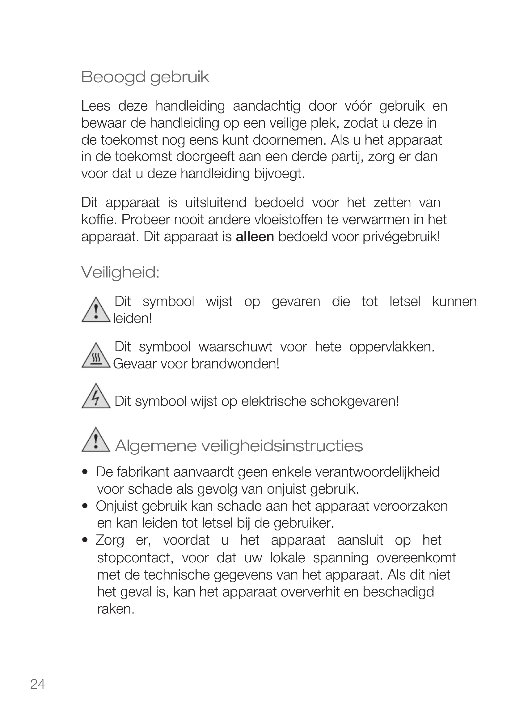- fordamagescausedbyowner This guarantee does not affect your statutory right, nor any legal right you may have as a costumer under applicable national legislation governing the purchase of goods. Inordertoasserthis/herrightinaguaranteecaseduringthe guaranteed period, the customer must provide evidence of the date of purchase (receipt). The guarantee is to be asserted against KORONA electric GmbH, Sundern/Germany. Service Address: KORONA Service, Am Steinbach 9, 59872 Meschede, Germany Telephone Hotline: 02933 90284-80 Mail: service@korona-electric.de web: www.korona-electric.de within 2 years after the date of purchase. In case of guarantee the customer is given the right to get the appliance repaired at our own or at an authorized shop. Further rights (due to guarantee case) are not given to the customer.24 Beoogd gebruik Lees deze handleiding aandachtig door vóór gebruik en bewaar de handleiding op een veilige plek, zodat u deze in de toekomst nog eens kunt doornemen. Als u het apparaat indetoekomstdoorgeeftaaneenderdepartij,zorgerdan voordatudezehandleidingbijvoegt. Dit apparaat is uitsluitend bedoeld voor het zetten van koffie. Probeer nooit andere vloeistoffen te verwarmen in het apparaat. Dit apparaat is alleen bedoeld voor privégebruik! Veiligheid: Dit symbool wijst op gevaren die tot letsel kunnen leiden! Dit symbool waarschuwt voor hete oppervlakken. Gevaar voor brandwonden! Ditsymboolwijstopelektrischeschokgevaren! Algemene veiligheidsinstructies
