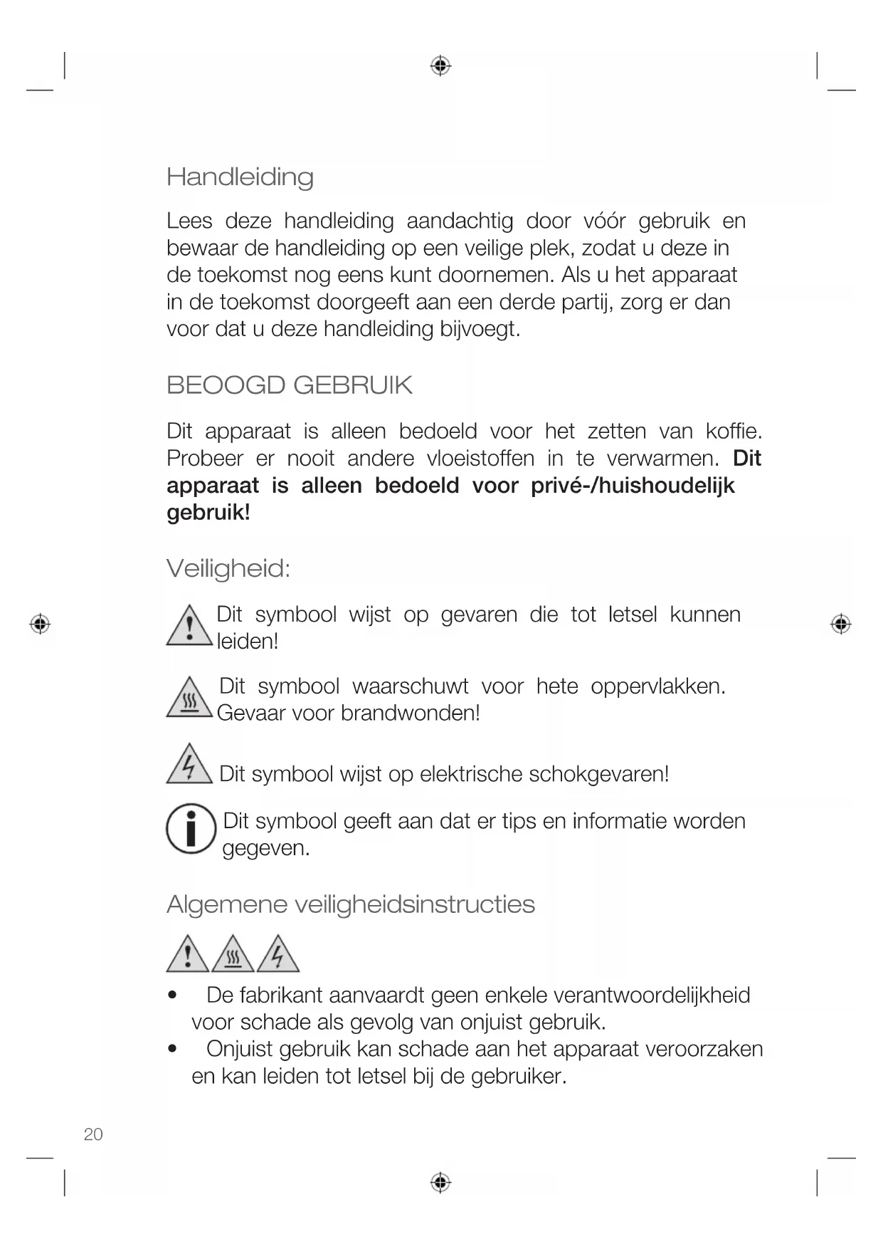 - fordamagescausedbyowner This guarantee does not affect your statutory right, nor any legal right you may have as a custumer under applicable national legislation governing the purchase of goods. In order to assert his/her right in a guarantee case during the guaranteed period, the customer must provide evidence of thedateofpurchase(receipt). The guarantee is to be asserted against KORONA electric GmbH, Sundern/Germany. Telephone Hotline: +49 2933 90284-80 Mail: service@korona-electric.de web: www.korona-electric.de within 2 years after the date of purchase. In case of guarantee the customer is given the right to get the appliance repaired atourownoratanauthorizedshop.Furtherrights(dueto guaranteecase)arenotgiventothecustomer.20 Handleiding Lees deze handleiding aandachtig door vóór gebruik en bewaar de handleiding op een veilige plek, zodat u deze in de toekomst nog eens kunt doornemen. Als u het apparaat in de toekomst doorgeeft aan een derde partij, zorg er dan voor dat u deze handleiding bijvoegt. BEOOGD GEBRUIK Dit apparaat is alleen bedoeld voor het zetten van koffie. Probeer er nooit andere vloeistoffen in te verwarmen. Dit apparaat is alleen bedoeld voor privé-/huishoudelijk gebruik! Veiligheid: Dit symbool wijst op gevaren die tot letsel kunnen leiden! Dit symbool waarschuwt voor hete oppervlakken. Gevaar voor brandwonden! Dit symbool wijst op elektrische schokgevaren! Dit symbool geeft aan dat er tips en informatie worden gegeven. Algemene veiligheidsinstructies