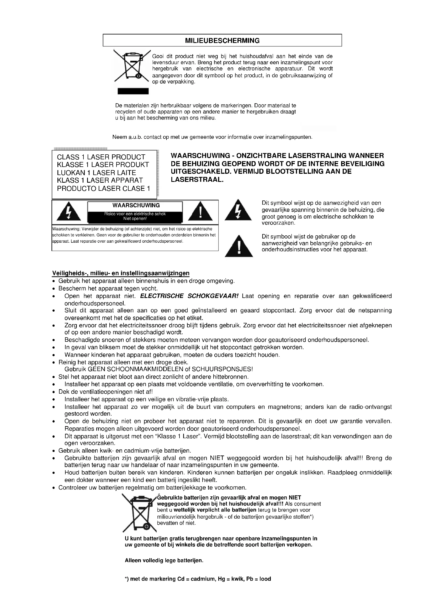 LASERSTRAAL. MILIEUBESCHERMING Gooi dit product niet weg bij het huishoudafval aan het einde van de levensduur ervan. Breng het product terug naar een inzamelingspunt voor hergebruik van electrische en electronische apparatuur. Dit wordt aangegeven door dit symbool op het product, in de gebruiksaanwijzing of op de verpakking. De materialen zijn herbruikbaar volgens de markeringen. Door materiaal te recyclen of oude apparaten op een andere manier te hergebruiken draagt u bij aan het bescherming van ons milieu. Neem a.u.b. contact op met uw gemeente voor informatie over inzamelingspunten. Waarschuwing: Verwijder de behuizing (of achterzijde) niet, om het risico op elektrische schokken te verkleinen. Geen voor de gebruiker te onderhouden onderdelen binnenin het apparaat. Laat reparatie over aan gekwalificeerd onderhoudspersoneel. Gebruikte batterijen zijn gevaarlijk afval en mogen NIET weggegooid worden bij het huishoudelijk afval!!! Als consument bent u wettelijk verplicht alle batterijen terug te brengen voor milieuvriendelijk hergebruik - of de batterijen gevaarlijke stoffen*) bevatten of niet. U kunt batterijen gratis terugbrengen naar openbare inzamelingspunten in uw gemeente of bij winkels die de betreffende soort batterijen verkopen. Alleen volledig lege batterijen.