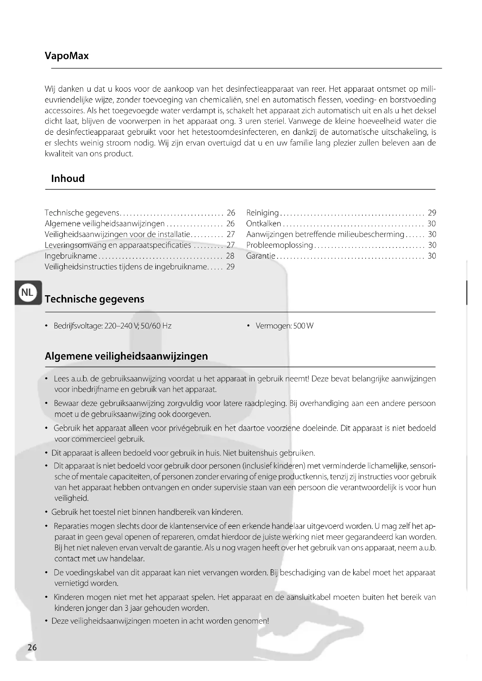 - Bedrijfsvoltage: 220–240 V; 50/60 Hz • Vermogen: 500 W NL27 Veiligheidsaanwijzingen voor de installatie Leveringsomvang en apparaatspecicaties