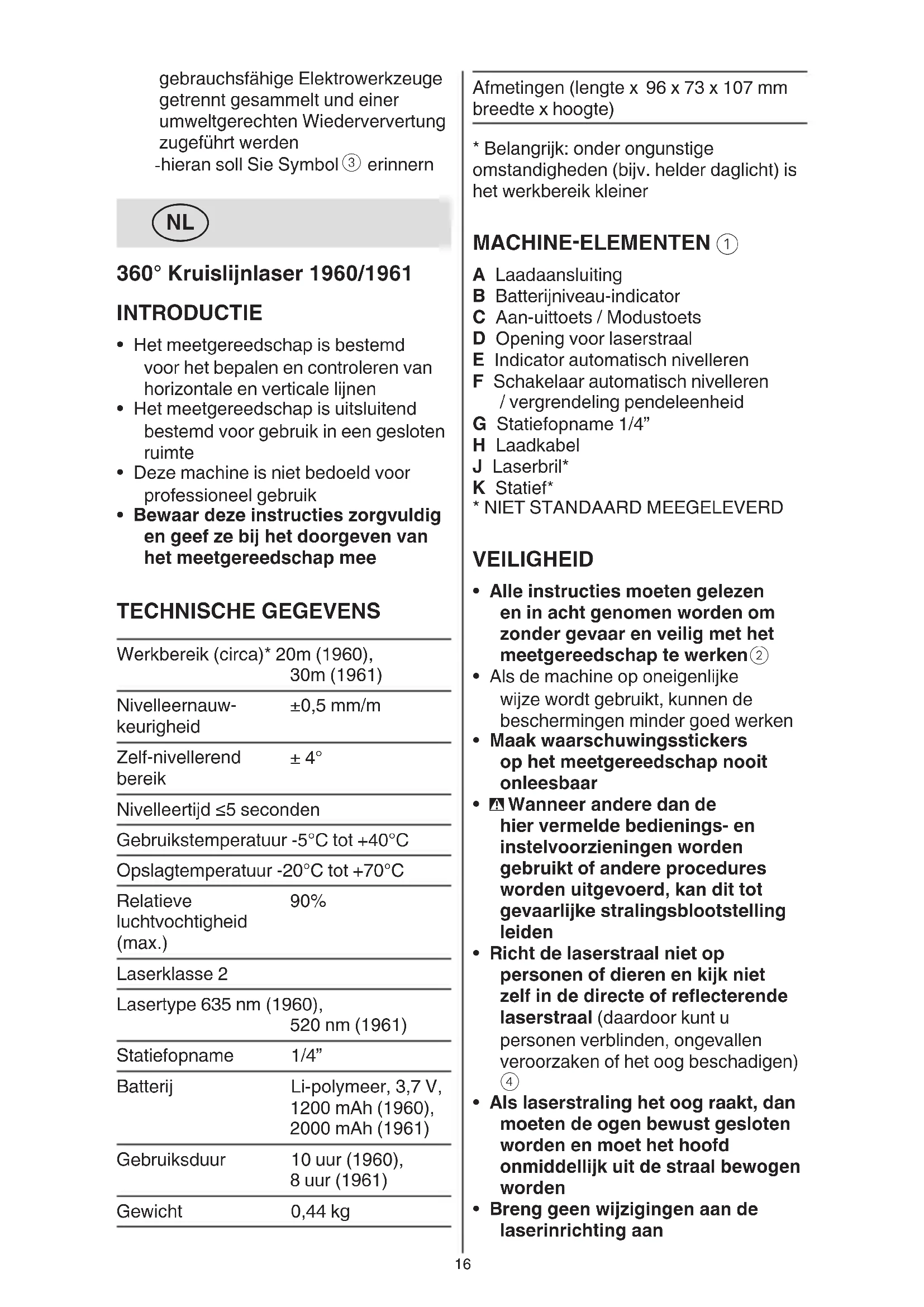 - Bewaar deze instructies zorgvuldig en geef ze bij het doorgeven van het meetgereedschap mee TECHNISCHE GEGEVENS Werkbereik (circa)* 20m (1960), 30m (1961) Nivelleernauw- keurigheid ±0,5 mm/m Zelf-nivellerend bereik ± 4° Nivelleertijd ≤5 seconden Gebruikstemperatuur -5°C tot +40°C Opslagtemperatuur -20°C tot +70°C Relatieve luchtvochtigheid (max.) 90% Laserklasse 2 Lasertype 635 nm (1960), 520 nm (1961) Statiefopname 1/4” Batterij Li-polymeer, 3,7 V, 1200 mAh (1960), 2000 mAh (1961) Gebruiksduur 10 uur (1960), 8 uur (1961) Gewicht 0,44 kg17 slechts 30 minuten of minder is te gebruiken - indicator B knippert GEEL om aan te geven dat de batterij wordt opgeladen en dat bij het huidige energieniveau het gereedschap nog langer dan 30 minuten is te gebruiken - indicator B knippert GROEN om aan te geven dat de batterij tot meer dan 90% van zijn capaciteit is opgeladen - indicator B licht continu GROEN op om aan te geven dat de batterij volledig is opgeladen