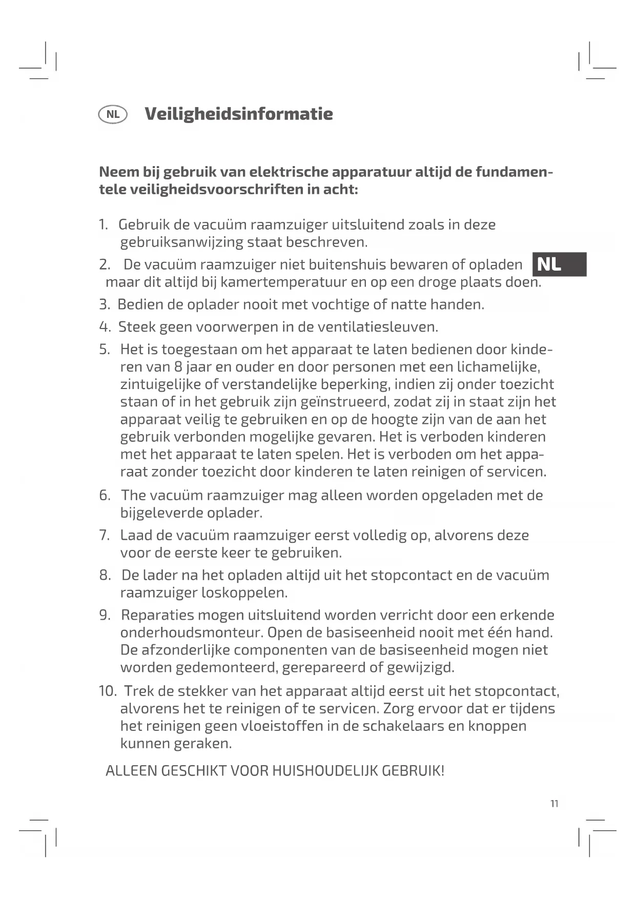 1. Gebruik de vacuüm raamzuiger uitsluitend zoals in deze