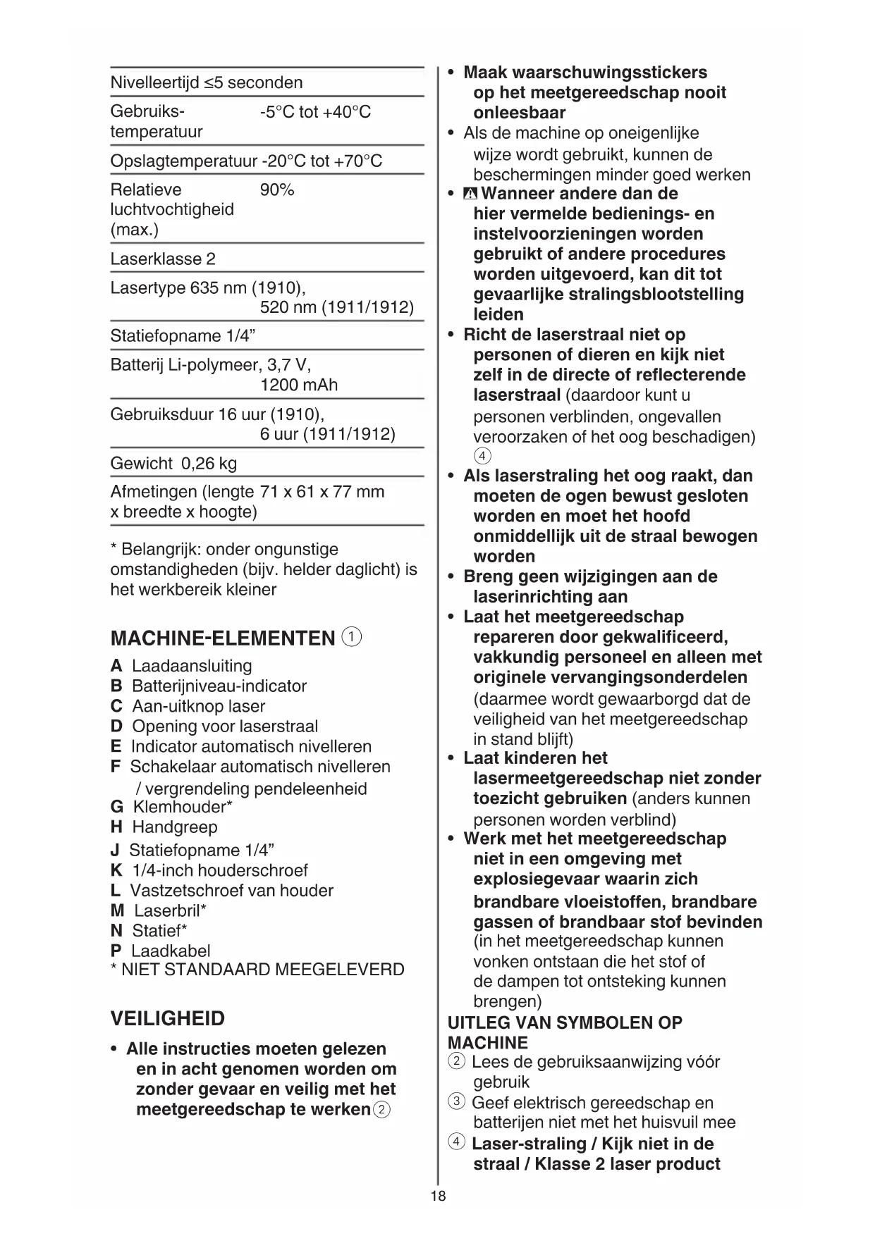 Laser-straling / Kijk niet in de straal / Klasse 2 laser product Nivelleertijd ≤5 seconden Gebruiks- temperatuur -5°C tot +40°C Opslagtemperatuur -20°C tot +70°C Relatieve luchtvochtigheid (max.) 90% Laserklasse 2 Lasertype 635 nm (1910), 520 nm (1911/1912) Statiefopname 1/4” Batterij Li-polymeer, 3,7 V, 1200 mAh Gebruiksduur 16 uur (1910), 6 uur (1911/1912) Gewicht 0,26 kg Afmetingen (lengte x breedte x hoogte) 71 x 61 x 77 mm