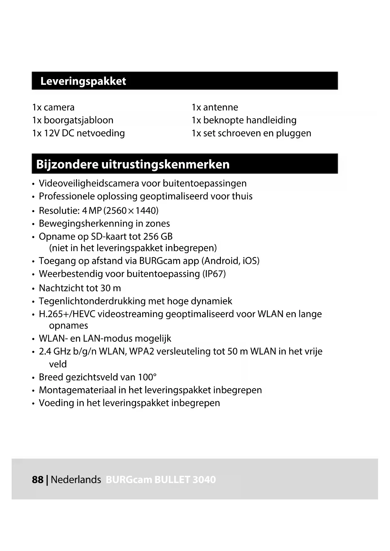 Gedetailleerde uitleg over de verschillende menupunten vindt u in de gebruiksershandleiding. Cameratype WLAN IR-bullet-camera voor inpandig en buiten gebruik Sensor 1/3" 4 MP Progressive Scan CMOS Resolutie 4 MP: 2560 x 1440 1080 p: 1920 x 1080 (= Full HD) 720 p: 1280 x 720 D1: 704 x 576 / 704 x 480 CIF: 352 x 288 / 352 x 240 Technische gegevens106 | Nederlands BURGcam BULLET 3040 BURGcam BULLET 3040 Nederlands | 107 Opnamesnelheid 20 fps @ 4 MP, 25 / 30 fps @ 1080 p IR-schijnwerper Tot 30 m bereik* IR blokkeerlter Mechanisch Objectief 2.8 mm F2.0 vast objectief Gezichtshoek Horizontaal: 100° Witafstelling Automatisch WLAN IEEE802.11b / g / n; tot 50 m (vrij veld) LAN (RJ-45) 10 / 100 Base-T Ondersteunde protocollen IPv4 / IPv6, HTTP, HTTPS, TCP / IP, UDP, UPnP, RTSP, RTP, SMTP, NTP, DHCP, DNS, DDNS, FTP, IP lter Micro-SD-kaart Max. 256 GB; voor opnames en foto's Installatie Incl. houder voor muur- of plafondmontage Voeding 12 V DC voeding in het leveringspakket inbegrepen. Vermogensopname < 4.8 W Temperatuurbereik -30 °C tot +50 °C108 | Nederlands BURGcam BULLET 3040 Veiligheidsklasse IP67 Afmetingen Ø 70 x 165 mm Gewicht 0.45 kg Extra functies: Tegenlichtcompensatie BLC / HLC / WDR Ruisreductie 3D Privézones 4 Bewegingsherkenningszones 4 Aanwijzingen: