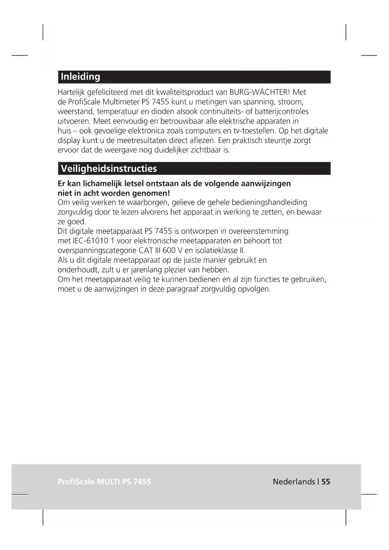 Sous réserve d’erreur et de modifications.ProfiScale MULTI PS 7455 Nederlands | 55 Inleiding Hartelijk gefeliciteerd met dit kwaliteitsproduct van BURG-WÄCHTER! Met de ProfiScale Multimeter PS 7455 kunt u metingen van spanning, stroom, weerstand, temperatuur en dioden alsook continuïteits- of batterijcontroles uitvoeren. Meet eenvoudig en betrouwbaar alle elektrische apparaten in huis – ook gevoelige elektronica zoals computers en tv-toestellen. Op het digitale display kunt u de meetresultaten direct aflezen. Een praktisch steuntje zorgt ervoor dat de weergave nog duidelijker zichtbaar is. Veiligheidsinstructies Er kan lichamelijk letsel ontstaan als de volgende aanwijzingen niet in acht worden genomen! Om veilig werken te waarborgen, gelieve de gehele bedieningshandleiding zorgvuldig door te lezen alvorens het apparaat in werking te zetten, en bewaar ze goed. Dit digitale meetapparaat PS 7455 is ontworpen in overeenstemming met IEC-61010 1 voor elektronische meetapparaten en behoort tot overspanningscategorie CAT III 600 V en isolatieklasse II. Als u dit digitale meetapparaat op de juiste manier gebruikt en onderhoudt, zult u er jarenlang plezier van hebben. Om het meetapparaat veilig te kunnen bedienen en al zijn functies te gebruiken, moet u de aanwijzingen in deze paragraaf zorgvuldig opvolgen. ProfiScale MULTI PS 7455 Nederlands | 5556 | Nederlands ProfiScale MULTI PS 7455