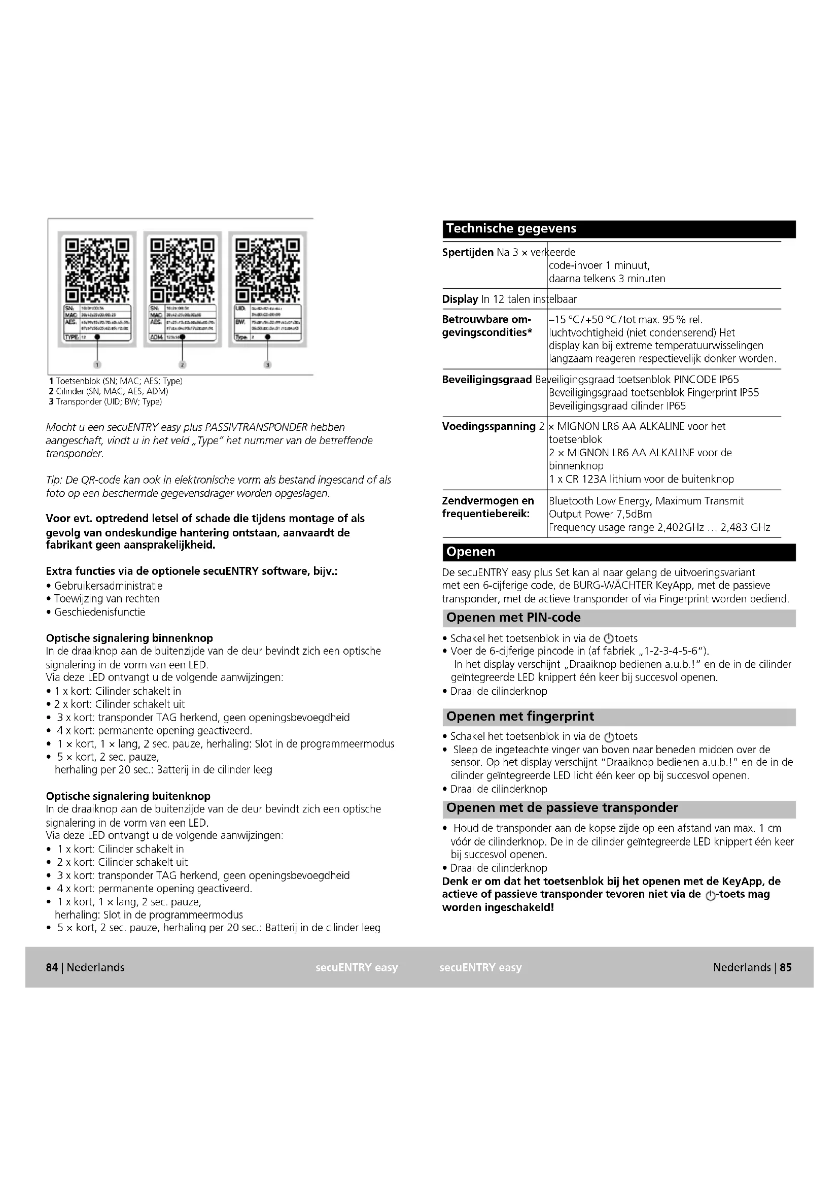 - secuENTRY easy plus PASSIVTRANSPONDER B de set-uitvoeringen secuENTRY easy plus PINCODE en secuENTRY easy plus FINGERPRINT is het toetsenblok al op de cilinder aangemeld. Administrator-code / QR-code Elke secuENTRY easy plus set met toetsenblok wordt geleverd met drie QR-codes, die zowel b de instelling van de openingsmogelkheid via de BURG-WÄCHTER KeyApp als voor het voor het naderhand aanmelden en inteachen (inleren) van een toetsenblok of een cilinder alsmede voor rmware updates benodigd zn. Zonder een bbehorend toetsenblok kunnen openingsmedia (gebruikers, actieve, passieve transponders) alleen via de optionele secuENTRY Windows PC-software op de cilinder worden ingeteacht. De administratorcode bevindt zich eveneens op de QR-code van de binnenknop (hoofdknop). In de secuENTRY easy plus PINCODE en de secuENTRY easy plus FINGERPRINT is de administratorcode af-fabriek op 1 – 2 – 3 – 4 – 5 – 6 ingesteld. U dient deze op de fabriek ingestelde administratorcode beslist in een persoonlke code tewzigen! Let op! B verlies van de administrator- en / of de QR-code is herprogrammeren resp. gebruiken van alle administratorfuncties niet meer mogelk. Deze daarom zorgvuldig bewaren! secuENTRY easy Nederlands | 8382 | Français secuENTRY easy84 | Nederlands secuENTRY easy secuENTRY easy Nederlands | 85 Technische gegevens Spertden Na 3 × verkeerde code-invoer 1 minuut, daarna telkens 3 minuten Display In 12 talen instelbaar Betrouwbare om- gevingscondities* –15 °C / +50 °C / tot max. 95 % rel. luchtvochtigheid (niet condenserend) Het display kan b extreme temperatuurwisselingen langzaam reageren respectievelk donker worden. Beveiligingsgraad Beveiligingsgraad toetsenblok PINCODE IP65 Beveiligingsgraad toetsenblok Fingerprint IP55 Beveiligingsgraad cilinder IP65 Voedingsspanning 2 × MIGNON LR6 AA ALKALINE voor het toetsenblok 2 × MIGNON LR6 AA ALKALINE voor de binnenknop 1 x CR 123A lithium voor de buitenknop Zendvermogen en frequentiebereik: Bluetooth Low Energy, Maximum Transmit Output Power 7,5dBm Frequency usage range 2,402GHz … 2,483 GHz Openen De secuENTRY easy plus Set kan al naar gelang de uitvoeringsvariant met een 6-cferige code, de BURG-WÄCHTER KeyApp, met de passieve transponder, met de actieve transponder of via Fingerprint worden bediend. Openen met PIN-code