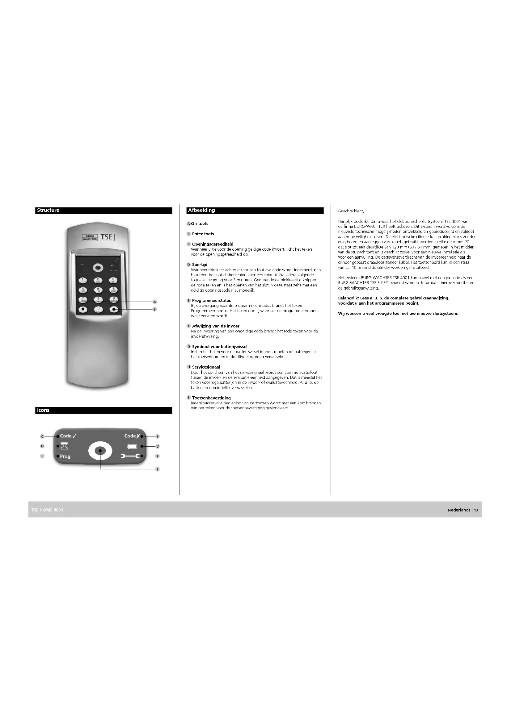 Toetsenbevestiging Iedere succesvolle bediening van de toetsen wordt met een kort branden van het teken voor de toetsenbevestiging gesignaleerd. Structure Geachte klant, Hartelijk bedankt, dat u voor het elektronische sluitsysteem TSE 4001 van de rma BURG-WÄCHTER heeft gekozen. Dit systeem werd volgens de nieuwste technische mogelijkheden ontwikkeld en geproduceerd en voldoet aan hoge veiligheidseisen. De elektronische cilinder kan probleemloos zonder enig boren en aanleggen van kabels gebruikt worden in elke deur met PZ- gat slot tot een deurdikte van 120 mm (60 / 60 mm, gemeten in het midden van de stulpschroef) en is geschikt zowel voor een nieuwe installatie als voor een aanvulling. De gegevensoverdracht van de invoereenheid naar de cilinder gebeurt draadloos zonder kabel. Het toetsenbord kan in een straal van ca. 10 m rond de cilinder worden geïnstalleerd. Het systeem BURG-WÄCHTER TSE 4001 kan zowel met een pincode als een BURG-WÄCHTER TSE E-KEY bediend worden. Informatie hierover vindt u in de gebruiksaanwijzing. Belangrijk: Lees a. u. b. de complete gebruiksaanwijzing, voordat u aan het programmeren begint. Wij wensen u veel vreugde toe met uw nieuwe sluitsysteem. Icons