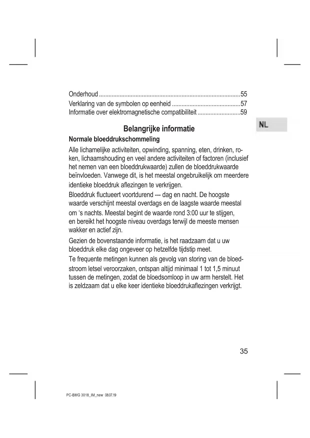 ontsmetten, indien nodig (bijvoorbeeld, in een ziekenhuis of in een kliniek). Veeg de binnenkant (de kant die contact met huid57 PC-BMG 3018_IM_new 08.07.19 maakt) van de manchet met een zachte doek af, bevochtigd met ethylalcohol (75 - 90 %) en uitgewrongen, droog vervolgens de manchet door te luchten. Verklaring van de symbolen op eenheid Symbool voor “DE GEBRUIKSAANWIJZING MOET WORDEN GELEZEN” Symbool voor “WAARSCHUWING” Symbool voor “TYPE BF TOEGEPASTE ONDERDELEN” (de manchet is een type BF toegepast onderdeel) Symbool voor “MILIEUBESCHERMING” - Afgedankte elektrische producten mogen niet bij het huishoudelijk afval worden weggegooid. Recycle wanneer daar de faci- liteiten voor zijn. Neem contact op met uw lokale autoriteit of verkoper voor nadere informatie over het recyclen. Symbool voor “FABRIKANT” De CE-markering geeft de conformiteit aan met de essentiële eisen van Richtlijn 93 / 42 / EEG betreffende medische hulpmiddelen. Symbool voor “DATUM VAN VERVAARDIGING” Symbool voor “EUROPESE VERTEGENWOORDIGING”58 PC-BMG 3018_IM_new 08.07.19