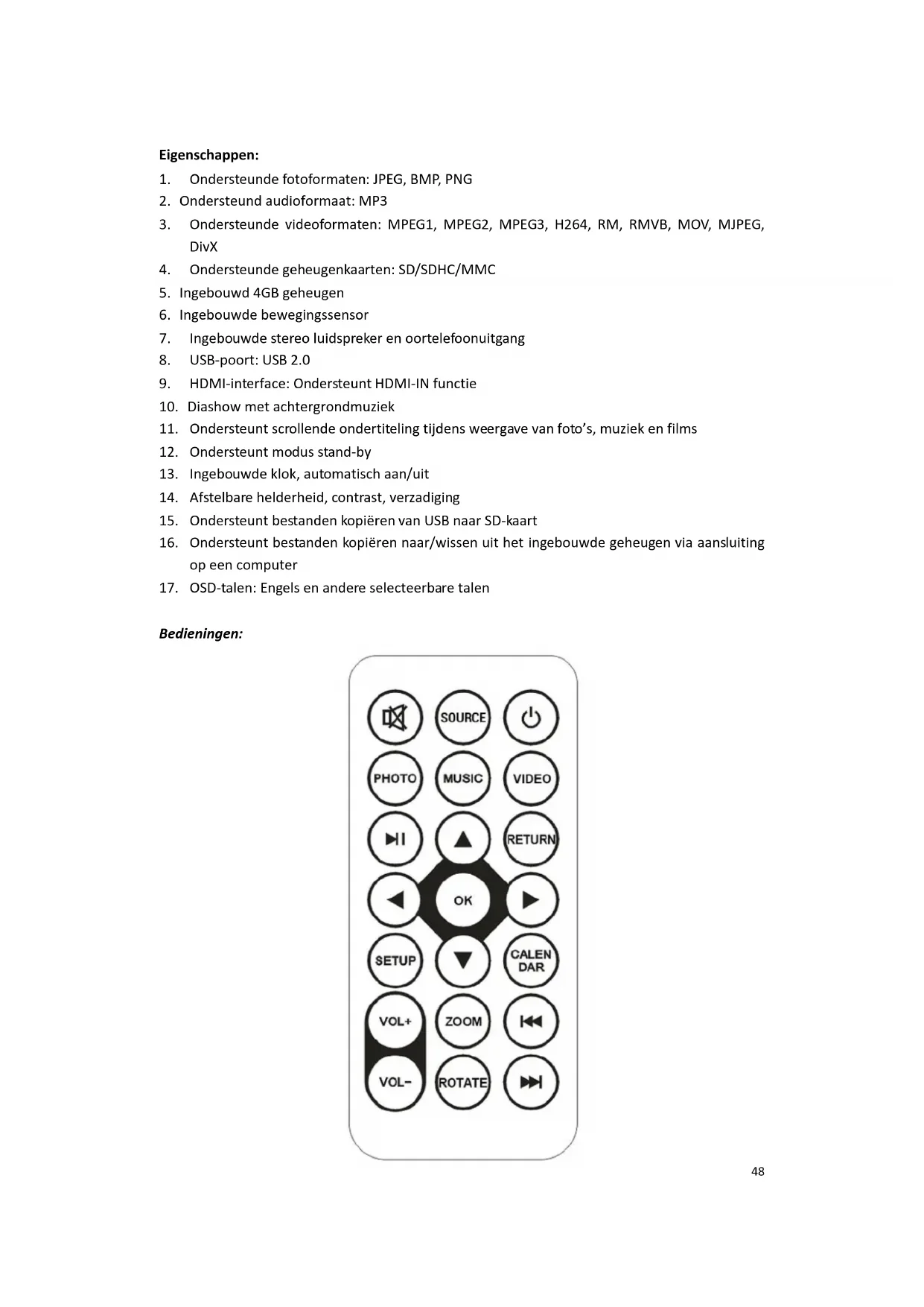 Bevestiging SETUP Instellingsmenu CALENDAR Kalenderfunctie direct openen VOL+ VOL- Volumeregeling ZOOM Een foto vergroten in de modus fotoweergave. ROTATE Een foto draaien in de modus fotoweergave