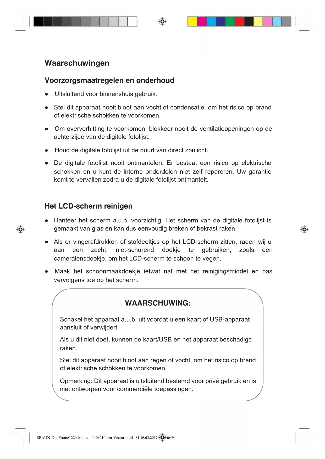 BRAUN-DigiFrame1220-Manual-140x210mm-Vector.indd 78 16.03.2017 13:16:4813 Impossibile leggere la SCHEDA o USB: Confermare se c'è spazio sufficiente sulla scheda o dispositivo USB. I dispositivi vuoti non possono essere letti. Impossibile riprodurre il file: Confermare se il formato del file è compatibile con il dispositivo. Display troppo chiaro o troppo scuro: Regolare la luminosità o il contrasto nel menu di configurazione. Il colore è troppo chiaro o non c'è colore: Regolare la configurazione del colore e del contrasto. Nessun suono: Verificare se il volume è corretto e che il lettore non sia in modalità Silenziamento. BRAUN-DigiFrame1220-Manual-140x210mm-Vector.indd 79 16.03.2017 13:16:48Waarschuwingen Voorzorgsmaatregelen en onderhoud ● Uitsluitend voor binnenshuis gebruik. ● Stel dit apparaat nooit bloot aan vocht of condensatie, om het risico op brand of elektrische schokken te voorkomen. ● Om oververhitting te voorkomen, blokkeer nooit de ventilatieopeningen op de achterzijde van de digitale fotolijst. ● Houd de digitale fotolijst uit de buurt van direct zonlicht. ● De digitale fotolijst nooit ontmantelen. Er bestaat een risico op elektrische schokken en u kunt de interne onderdelen niet zelf repareren. Uw garantie komt te vervallen zodra u de digitale fotolijst ontmantelt. Het LCD-scherm reinigen ● Hanteer het scherm a.u.b. voorzichtig. Het scherm van de digitale fotolijst is gemaakt van glas en kan dus eenvoudig breken of bekrast raken. ● Als er vingerafdrukken of stofdeeltjes op het LCD-scherm zitten, raden wij u aan een zacht, niet-schurend doekje te gebruiken, zoals een cameralensdoekje, om het LCD-scherm te schoon te vegen. ● Maak het schoonmaakdoekje ietwat nat met het reinigingsmiddel en pas vervolgens toe op het scherm. WAARSCHUWING: Schakel het apparaat a.u.b. uit voordat u een kaart of USB-apparaat aansluit of verwijdert. Als u dit niet doet, kunnen de kaart/USB en het apparaat beschadigd raken. Stel dit apparaat nooit bloot aan regen of vocht, om het risico op brand of elektrische schokken te voorkomen. Opmerking: Dit apparaat is uitsluitend bestemd voor privé gebruik en is niet ontworpen voor commerciële toepassingen. BRAUN-DigiFrame1220-Manual-140x210mm-Vector.indd 81 16.03.2017 13:16:491 Inleiding: Hartelijk bedankt voor het aanschaffen van de BRAUN DigiFrame 1220. Het product is ontworpen om foto’s genomen met uw digitale camera of mobiele telefoon of opgeslagen op een geheugenkaart snel en eenvoudig weer te geven. Lees deze gebruikshandleiding a.u.b. zorgvuldig door, zodat u de digitale fotolijst correct weet te gebruiken. BRAUN-DigiFrame1220-Manual-140x210mm-Vector.indd 82 16.03.2017 13:16:492 Eigenschappen: