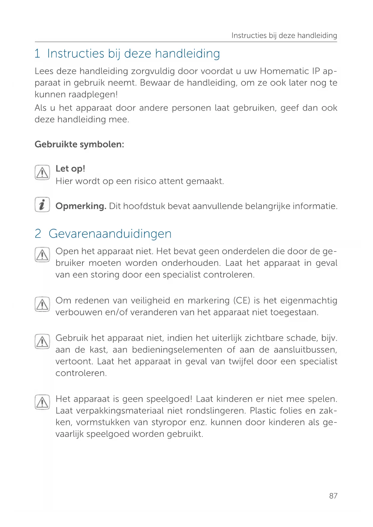 - 11 Technische gegevens Instructies bij deze handleiding 1 Instructies bij deze handleiding Lees deze handleiding zorgvuldig door voordat u uw Homematic IP ap- paraat in gebruik neemt. Bewaar de handleiding, om ze ook later nog te kunnen raadplegen! Als u het apparaat door andere personen laat gebruiken, geef dan ook deze handleiding mee. Gebruikte symbolen: Let op! Hier wordt op een risico attent gemaakt. Opmerking. Dit hoofdstuk bevat aanvullende belangrijke informatie. 2 Gevarenaanduidingen Open het apparaat niet. Het bevat geen onderdelen die door de ge- bruiker moeten worden onderhouden. Laat het apparaat in geval van een storing door een specialist controleren. Om redenen van veiligheid en markering (CE) is het eigenmachtig verbouwen en/of veranderen van het apparaat niet toegestaan. Gebruik het apparaat niet, indien het uiterlijk zichtbare schade, bijv. aan de kast, aan bedieningselementen of aan de aansluitbussen, vertoont. Laat het apparaat in geval van twijfel door een specialist controleren. Het apparaat is geen speelgoed! Laat kinderen er niet mee spelen. Laat verpakkingsmateriaal niet rondslingeren. Plastic folies en zak- ken, vormstukken van styropor enz. kunnen door kinderen als ge- vaarlijk speelgoed worden gebruikt.88 Werking en overzicht van het apparaat Voor zaak- of personenschade die door een onjuist gebruik of niet-naleving van de gevarenaanduidingen veroorzaakt is, stellen wij ons niet aansprakelijk. In dergelijke gevallen vervalt ieder garantie- recht! Voor gevolgschade stellen wij ons niet aansprakelijk! Gebruik het apparaat op een tegen weer en wind beschermde plaats. Niet blootstellen aan de invloed van trillingen, langdurig zonlicht of andere warmtebronnen en mechanische belastingen. Het apparaat is uitsluitend geschikt voor gebruik in woonruimten en soortgelijke omgevingen. Elk ander gebruik dan wat in deze handleiding beschreven wordt, is oneigenlijk en leidt tot de uitsluiting van garantie en aansprakelijkheid. 3 Werking en overzicht van het apparaat Met de Homematic IP Keypad kunt u in combinatie met uw Homematic IP Deurslotaandrijving tot max. 8 familieleden, vrienden e.a. toegang ver- lenen tot uw smarthome. Per pin-invoer kan de deur geopend, vergren- deld of ontgrendeld worden. Bovendien kunnen met verdere Homematic IP componenten veelzijdige Coming-/Leaving-Home-scenario’s worden aangelegd (bijv. het inschakelen van de vloerverlichting). De configuratie en de actuele statusweergave van de deur geschieden via de gratis Homematic IP app. Dankzij de draadloze communicatie en de batterijvoeding kunt u de montageplaats flexibel kiezen. Er is geen netaansluiting dicht bij de deur vereist. Voor de montage op de door u gewenste plaats kunt u de bijge- leverde schroeven en pluggen gebruiken. De geïntegreerde naderingssensor biedt u extra comfort. Zo kunt u de toetsen van uw Keypad ook bij een matige buitenverlichting te allen tijde herkennen dankzij de geïntegreerde verlichting.89 Algemene systeeminformatie Overzicht van het apparaat (zie afbeelding 1 en 2): (A) Wandhouder (B) Keypad (C) Toetsenveld met toetsen 0-9 (D) Toets ‘Vergrendelen’ (E) Toets ‘Ontgrendelen’ (F) Naderingsschakelaar (G) Apparaatled (H) Systeemtoets (aanleertoets) (I) Sabotagecontact (J) Batterijvak(deksel) (K) Opening voor waterafvoer (L) Schroefgaten (M) Vergrendeling 4 Algemene systeeminformatie Dit apparaat is een onderdeel van het Homematic IP Smart Home Sys- teem en communiceert via het Homematic IP zendprotocol. Alle ap- paraten van het systeem kunnen comfortabel en individueel via een smartphone met de Homematic IP App worden geconfigureerd. U hebt ook de mogelijkheid om de Homematic IP apparaten via de cen- trale CCU3 of in combinatie met vele partneroplossingen te gebruiken. Welke functies binnen het systeem in combinatie met andere compo- nenten mogelijk zijn, vindt u in het Homematic IP gebruikershandboek. Alle technische documenten en updates vindt u in de actuele versie op www.homematic-ip.com.90 Inbedrijfstelling 5 Inbedrijfstelling p. 9987