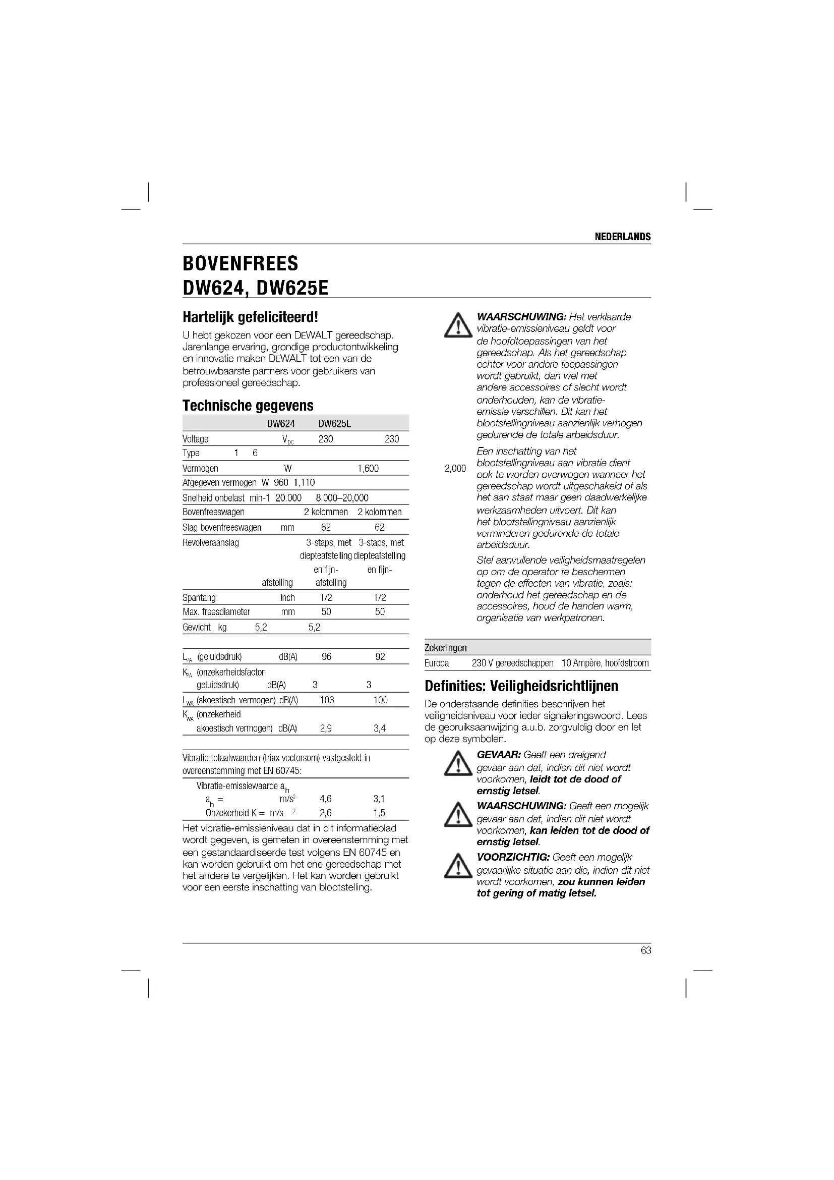 BOVENFREES DW624, DW625E Hartelijk gefeliciteerd! U hebt gekozen voor een DEWALT gereedschap. Jarenlange ervaring, grondige productontwikkeling en innovatie maken DEWALT tot een van de betrouwbaarste partners voor gebruikers van professioneel gereedschap. Technische gegevens DW624 DW625E Voltage V