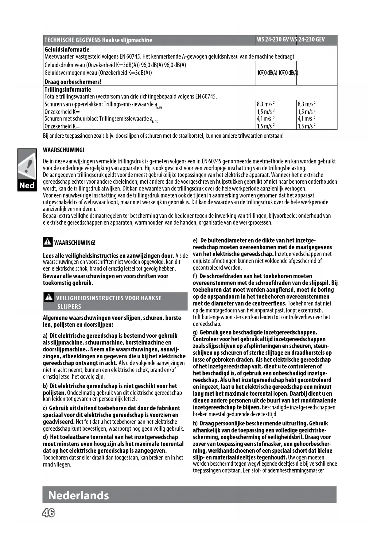 We verklaren geheel onder eigen verantwoordelijkheid dat het pro- duct in de “Technische data” voldoet aan alle relevante bepalingen van de richtlijnen 2011/65/EU (RoHS), 2006/42/EG, 2014/30/EU en de volgende geharmoniseerde normen EN 60745-1:2009 + A11:2010 EN 60745-2-3:2011 + A2:2013 + A11:2014 + A12:2014 EN 55014-1:2006+A1:2009+A2:2011 EN 55014-2:2015 EN 50581:2012 WS 22-180 E, WS 22-230 E, WS 24-230 GEV: EN 61000-3-2:2014 EN 61000-3-3:2013 WS 22-180, WS 22-230, WS 24-230 GV: EN 61000-3-11:2000 zijn gebruikt. Winnenden, 2017-09-25 Alexander Krug / Managing Director Gemachtigd voor samenstelling van de technische documenten Techtronic Industries GmbH Max-Eyth-Straße 10, 71364 Winnenden, Germany SYMBOLEN OPGELET! WAARSCHUWING! GEVAAR! Graag instructies zorgvuldig doorlezen vóórdat u de machine in gebruik neemt. Bij het werken met de machine altijd een veiligheidsbril dragen. Draag veiligheidshandschoenen! Voor alle werkzaamheden aan de machine de stekker uit de kontaktdoos trekken. Geen kracht uitoefenen. Alleen voor het doorslijpen. Alleen voor het schuren. Toebehoren - Wordt niet meegeleverd. Is apart leverbaar. Zie hiervoor het toebehorenprogramma. Elektrische apparaten mogen niet via het huisafval worden afgevoerd. Elektrische en elektronische apparaten moeten gescheiden worden verzameld en voor een milieuvrien- delijke afvoer worden afgegeven bij een recyclingbedrijf. Informeer bij uw gemeente of bij uw vakhandelaar naar recyclingbedrijven en inzamelpunten. Elektrisch gereedschap van de beschermingsklasse