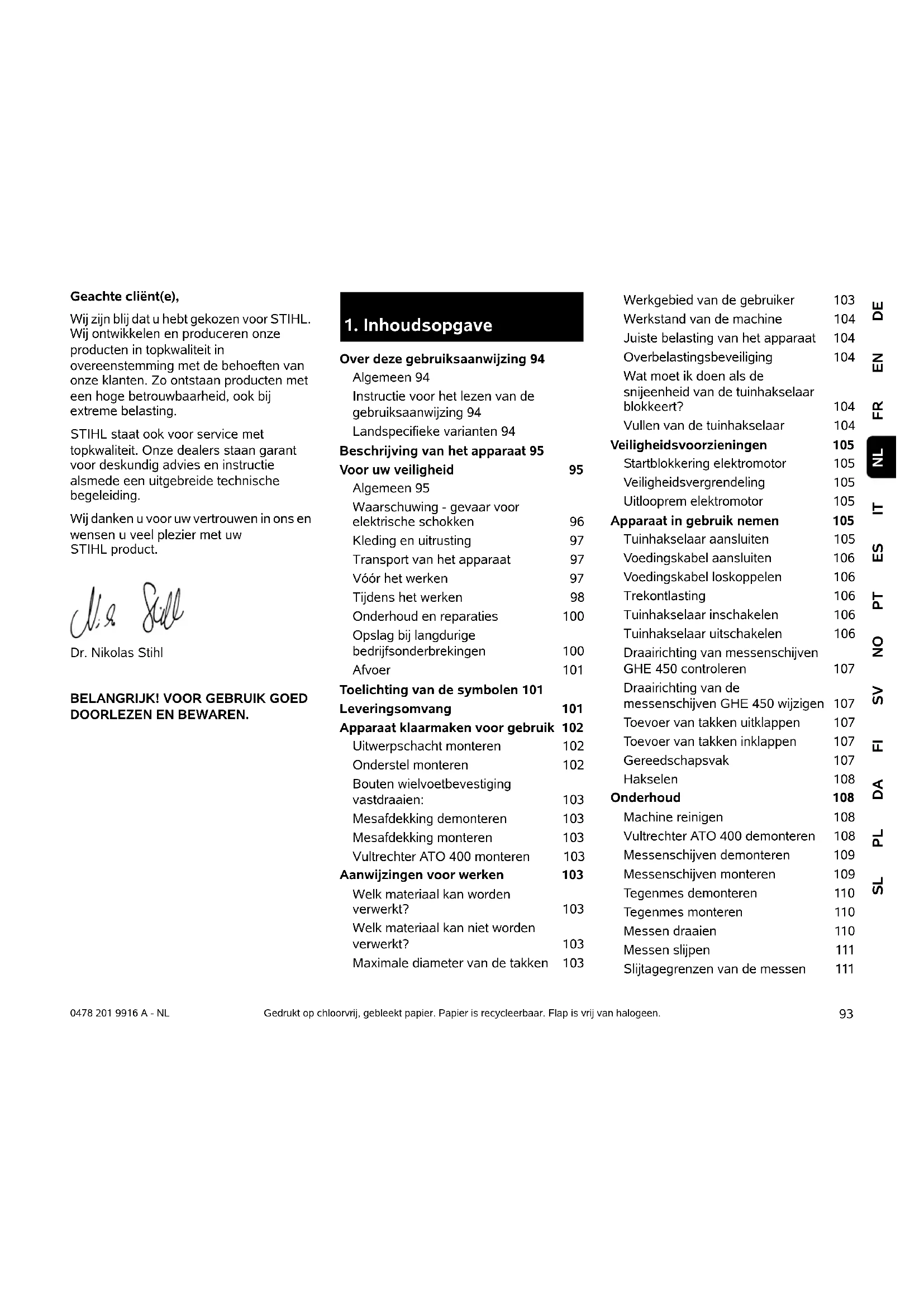 DEENFRITESPTNOSVFIDAPLSL NL 0478 201 9916 A - NL Geachte cliënt(e), Wij zijn blij dat u hebt gekozen voor STIHL. Wij ontwikkelen en produceren onze producten in topkwaliteit in overeenstemming met de behoeften van onze klanten. Zo ontstaan producten met een hoge betrouwbaarheid, ook bij extreme belasting. STIHL staat ook voor service met topkwaliteit. Onze dealers staan garant voor deskundig advies en instructie alsmede een uitgebreide technische begeleiding. Wij danken u voor uw vertrouwen in ons en wensen u veel plezier met uw STIHL product. Dr. Nikolas Stihl