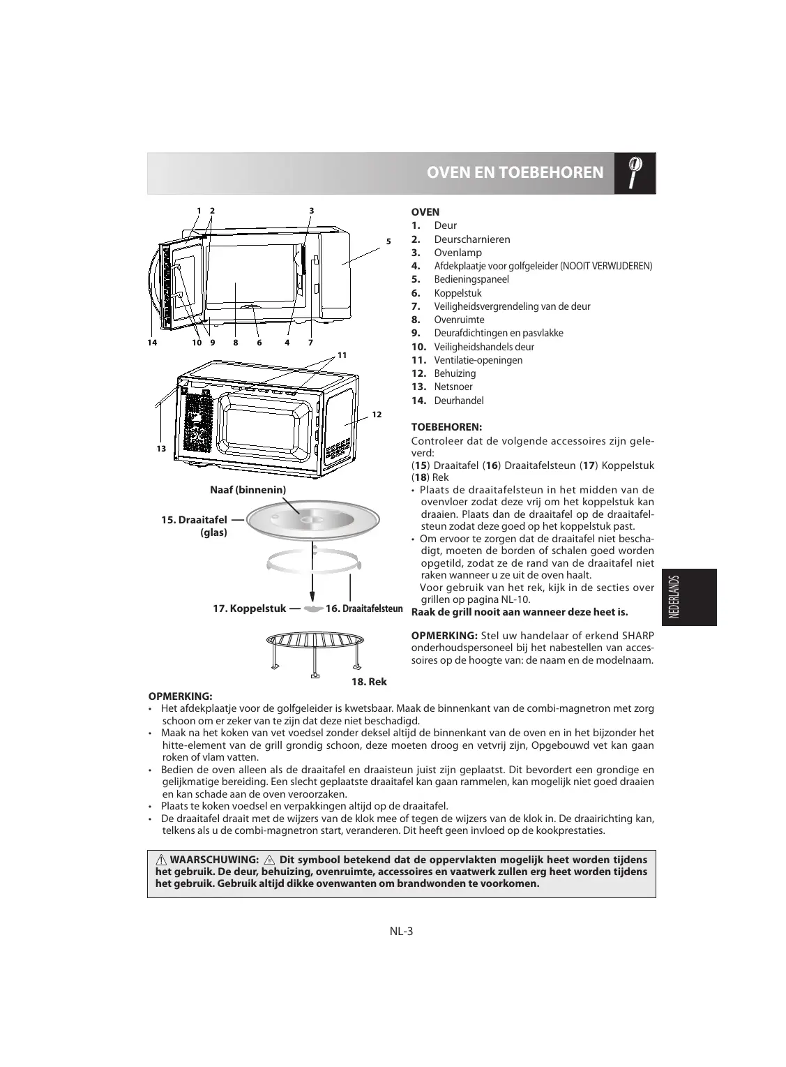 WAARSCHUWING: Dit symbol betekend dat de oppervlakten möglichk heet wordenijdens het gebruik. De deur, behuizing, ovenruimte, accessoires en vaatwerk zullen erg heet wordenijdens het gebruik. Gebruik algtd/DDIkke ovenwanten om brandwonden te voorkomen.