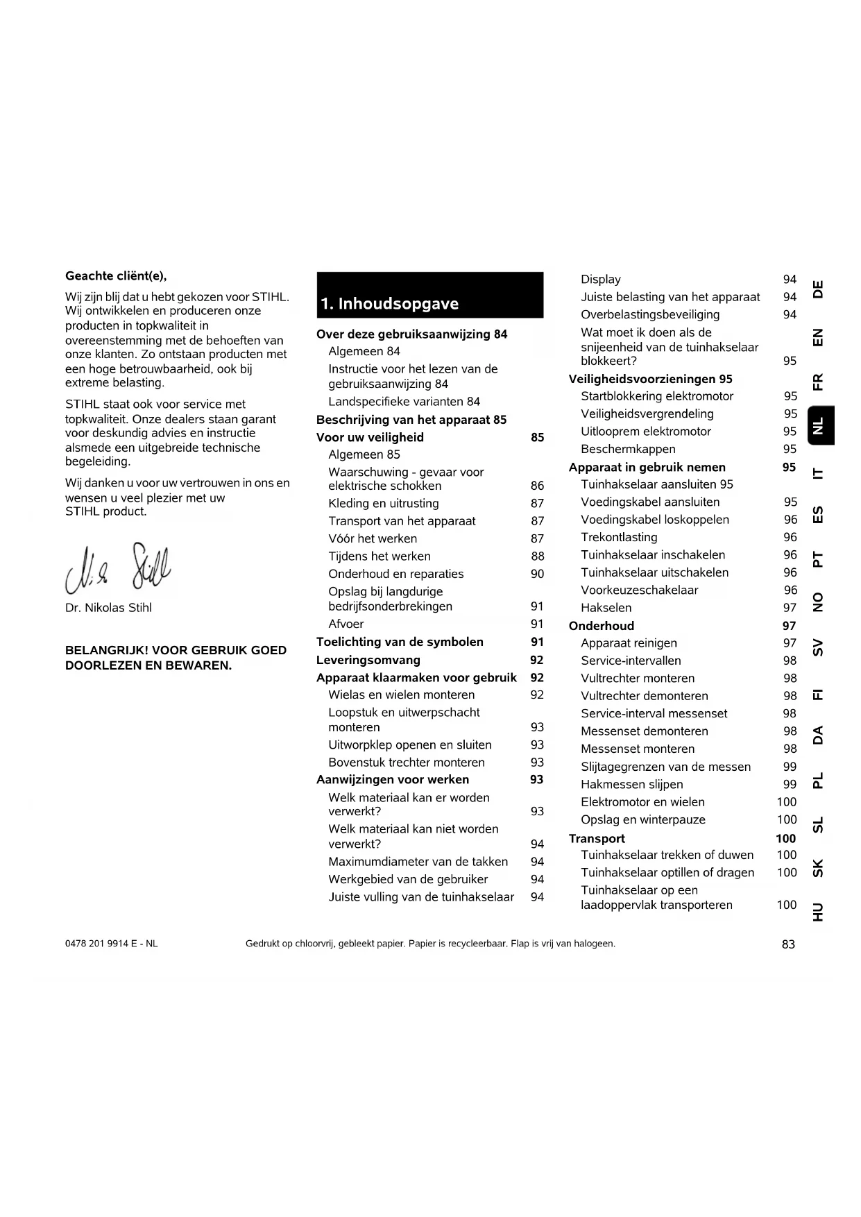 Il confirmera l’exécution des travaux d’entretien en complétant les champs préimprimés. Entretien exécuté le Date du prochain entretien83 DEENFRITESPTNOSVFIDAPLSLSKHU NL 0478 201 9914 E - NL Geachte cliënt(e), Wij zijn blij dat u hebt gekozen voor STIHL. Wij ontwikkelen en produceren onze producten in topkwaliteit in overeenstemming met de behoeften van onze klanten. Zo ontstaan producten met een hoge betrouwbaarheid, ook bij extreme belasting. STIHL staat ook voor service met topkwaliteit. Onze dealers staan garant voor deskundig advies en instructie alsmede een uitgebreide technische begeleiding. Wij danken u voor uw vertrouwen in ons en wensen u veel plezier met uw STIHL product. Dr. Nikolas Stihl