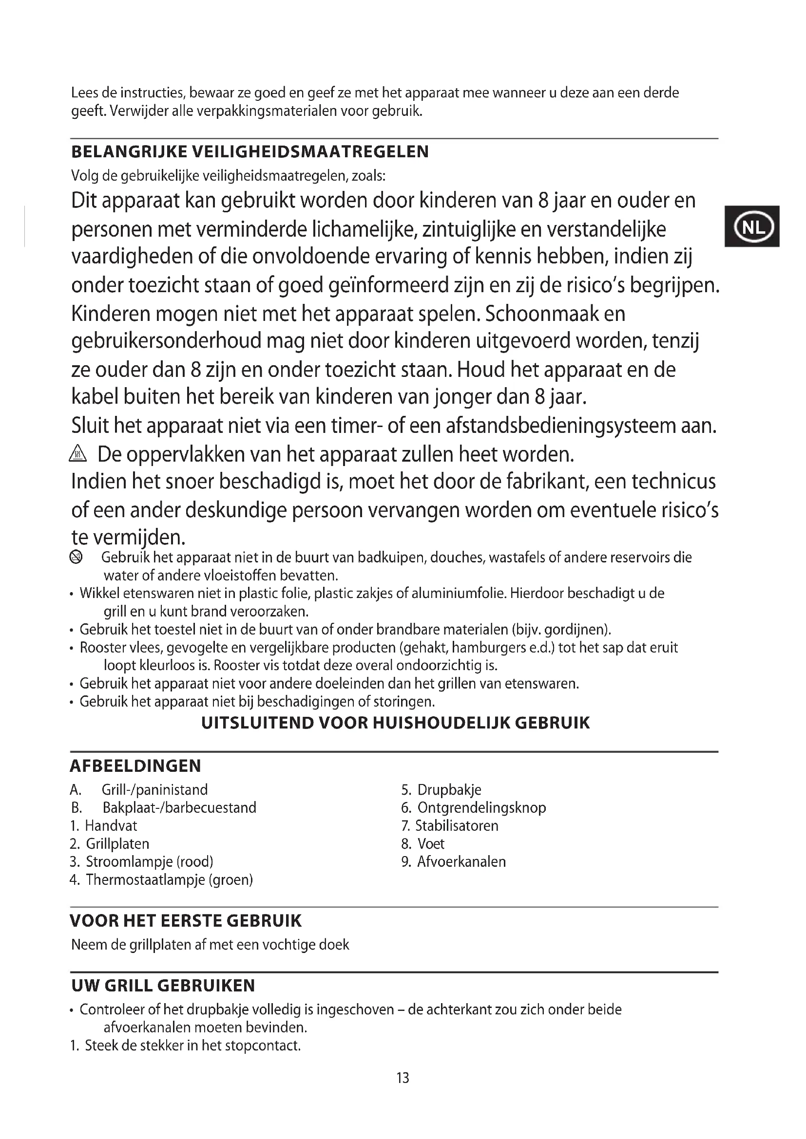 let 5-7 fromage 2-3 aloyau 7-8 jambon (cuit) 5-6 hamburger, 100 g 7-8 brochettes, cubes de 25 mm 7-8 7-8 SNACKS bifteck (tranche) 5-7 calzone (pizza souée) 8-9 saucisses 6-8 hot dogs 2-3 faux let 7-9 T-Bone (steak à l’os) 8-9 POULET/DINDE morceaux de poitrine de poulet 5-7 AGNEAU cuisses (poulet) 5-7 brochettes, cubes de 25 mm 7-8 7-8 poitrine de dinde, en tranches 3-4 côtes premières 4-6 LÉGUMES FRUITS DE MER asperges 3-4 let de saumon 3-4 aubergines, tranche/cube 8-9 let de bar (loup) 3-5 oignons, nes tranches 5-6 darne de étan, 12-25 mm 6-8 poivrons, nes tranches 6-8 darne de saumon, 12-25 mm 6-8 poivrons, grillés puis pelés 2-3 darne d’espadon, 12-25 mm 6-9 poivrons entiers brossés à l’huile 8 darne de thon, 12-25 mm 6-8 pommes de terre, tranche/cube 7-9 brochettes, cubes de 25 mm 4-6 crevettes roses 1-2 FRUITS coquilles St Jacques 4-6 pommes, demi/tranche 6-8 PORC bananes, tranches dans la longueur 3-4 côtelettes, 12 mm 5-6 nectarines, demi/tranche 3-5 3-5 tranche de jambon salé/fumé 5-6 pêches, demi/tranche 3-5 brochettes, cubes de 25 mm 7-8 7-8 ananas, tranche 3-7 saucisses 6-8 let, 12 mm 4-613 Lees de instructies, bewaar ze goed en geef ze met het apparaat mee wanneer u deze aan een derde geeft. Verwijder alle verpakkingsmaterialen voor gebruik. BELANGRIJKE VEILIGHEIDSMAATREGELEN Volg de gebruikelijke veiligheidsmaatregelen, zoals: Dit apparaat kan gebruikt worden door kinderen van 8 jaar en ouder en personen met verminderde lichamelijke, zintuiglijke en verstandelijke vaardigheden of die onvoldoende ervaring of kennis hebben, indien zij onder toezicht staan of goed geïnformeerd zijn en zij de risico’s begrijpen. Kinderen mogen niet met het apparaat spelen. Schoonmaak en gebruikersonderhoud mag niet door kinderen uitgevoerd worden, tenzij ze ouder dan 8 zijn en onder toezicht staan. Houd het apparaat en de kabel buiten het bereik van kinderen van jonger dan 8 jaar. Sluit het apparaat niet via een timer- of een afstandsbedieningsysteem aan. ¬ De oppervlakken van het apparaat zullen heet worden. Indien het snoer beschadigd is, moet het door de fabrikant, een technicus of een ander deskundige persoon vervangen worden om eventuele risico’s te vermijden. b Gebruik het apparaat niet in de buurt van badkuipen, douches, wastafels of andere reservoirs die water of andere vloeistoen bevatten.