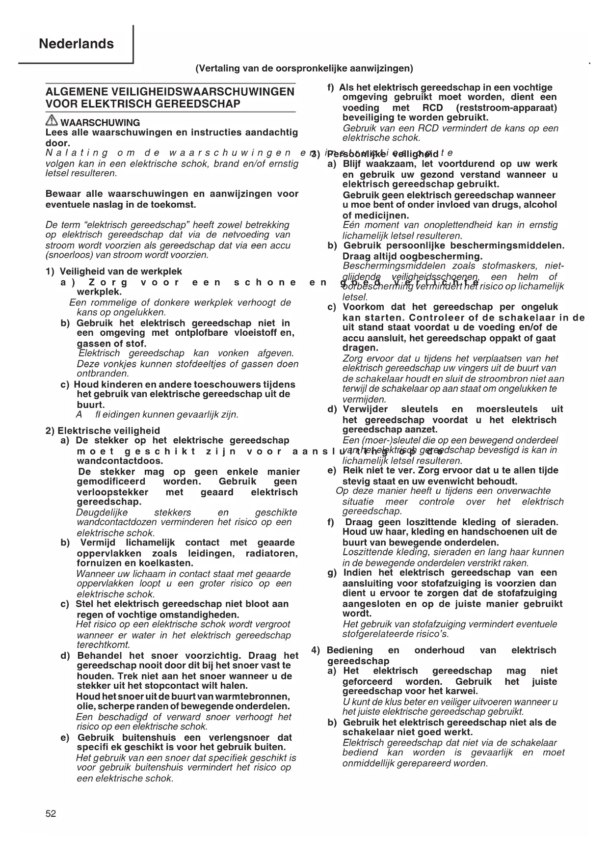 Veilige gebruiksmethoden ● Oefening a) Lees de instructies aandachtig door. Maak u vertrouwd met de bediening en het correct gebruik van de machine. b) Laat nooit personen die niet vertrouwd zijn met deze instructies of kinderen gebruik maken van het apparaat. Plaatselijke bepalingen kunnen beperkingen opleggen aan de leeftijd van de gebruiker. c) Houd er rekening mee dat de operator of gebruiker verantwoordelijk is voor ongevallen of risico's die zich voordoen ten aanzien van andere personen of hun eigendom. ● Voorbereiding a) Inspecteer de machine voor gebruik altijd eerst op beschadigde, ontbrekende of misplaatste beschermingen of afschermingen. b) Gebruik het apparaat nooit als er zich personen, vooral kinderen of huisdieren in de buurt bevinden. ● Bediening a) Draag te allen tijde oogbescherming en stevige schoenen tijdens het bedienen van de machine. b) Vermijd het gebruik van de machine tijdens slechte weersomstandigheden, in het bijzonder wanneer er een risico van blikseminslag bestaat. 000BookCH10DL.indb53000BookCH10DL.indb53 2016/05/2315:22:212016/05/2315:22:2154 Nederlands c) Gebruik het apparaat enkel bij daglicht of helder kunstlicht. d) Gebruik het apparaat nooit met beschadigde beschermkappen of afdekkingen of zonder dat de beschermkappen of afdekkingen op hun plaats zijn aangebracht. e) Schakel de motor enkel in wanneer handen en voeten uit de buurt van de knipmessen zijn. f) Koppel de machine altijd los van de stroomtoevoer (d.w.z. verwijder de stekker uit het stopcontact of verwijder het uitschakelmechanisme of de verwijderbare batterij) – wanneer de machine onbeheerd wordt achtergelaten; – alvorens een blokkade te verwijderen; – alvorens het apparaat te controleren, te reinigen of er werk aan uit te voeren; – na het stoten tegen een vreemd voorwerp; – telkens wanneer het apparaat abnormaal begint te trillen. g) Wees voorzichtig om letsel aan voeten en handen door de knipmessen te voorkomen. h) Zorg er altijd voor dat de ventilatieopeningen vrij blijven van afval. ● Onderhoud en opslag a) Maak het apparaat los van de stroomtoevoer (d.w.z. haal de stekker uit het stopcontact of verwijder de uitschakelinrichting) alvorens onderhoud aan het apparaat uit te voeren of dit te reinigen. b) Gebruik uitsluitend de vervangingsonderdelen en accessoires die door de fabrikant zijn aanbevolen. c) Voer regelmatig inspecties en onderhoud aan het apparaat uit. Laat het apparaat enkel door een erkende reparateur repareren. d) Wanneer het apparaat niet wordt gebruikt, dit buiten het bereik van kinderen bewaren. VOORZORGSMAATREGELEN VOOR