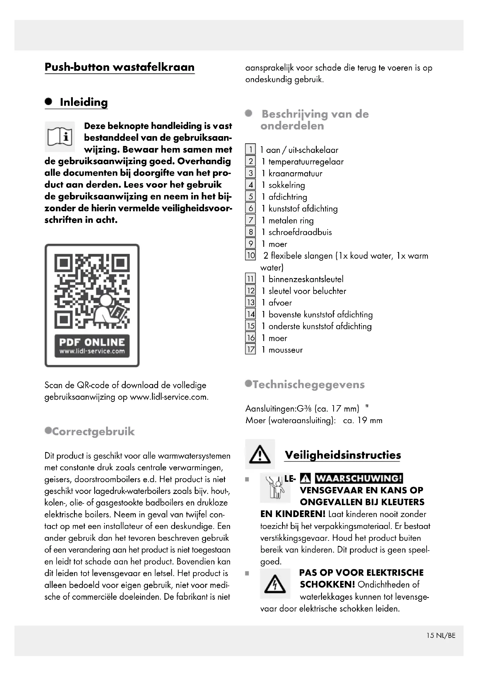 1 mousseur Technische gegevens Aansluitingen: G⅜ (ca. 17 mm) Moer (wateraansluiting): ca. 19 mm Veiligheidsinstructies LE-