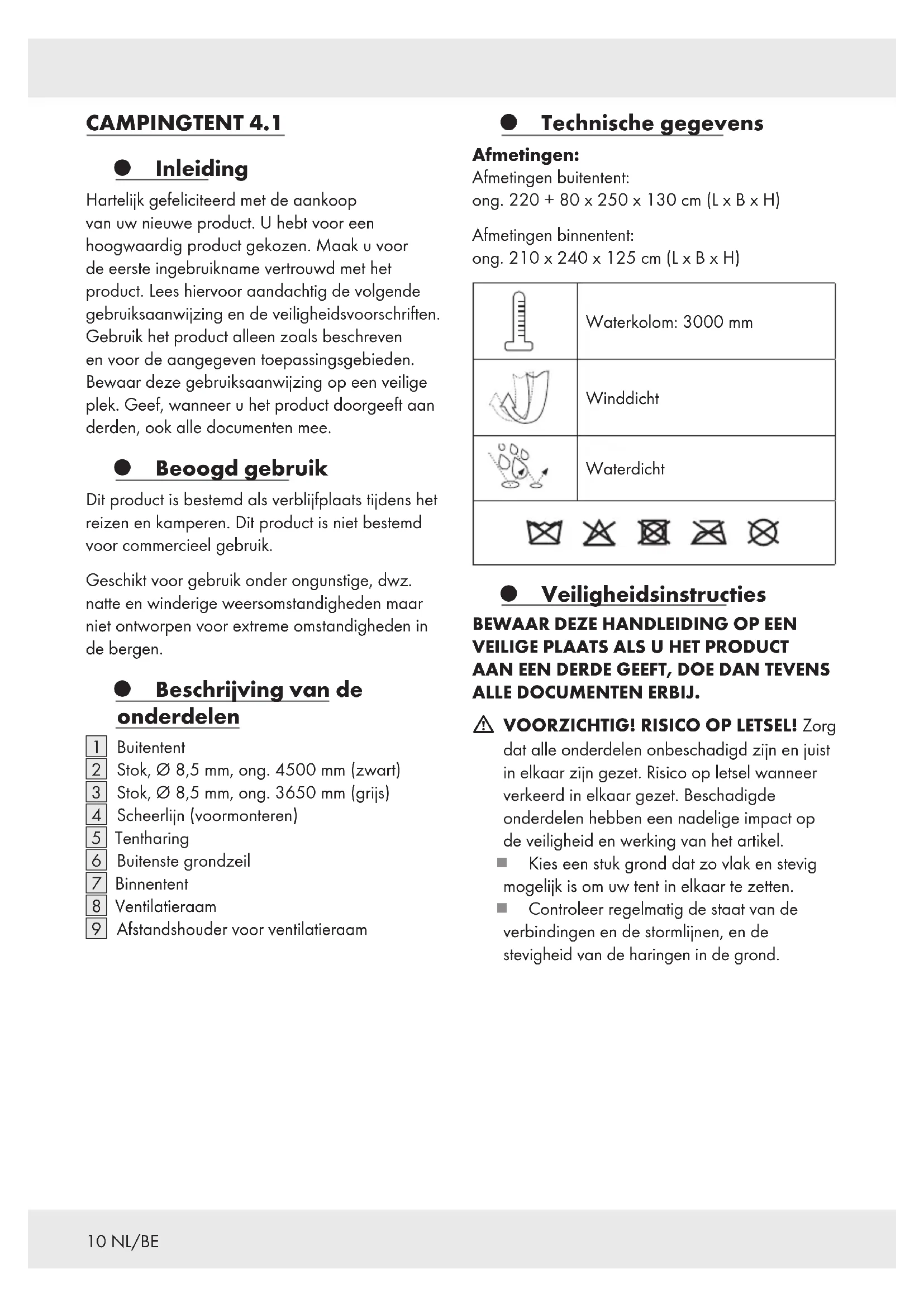 VOORZICHTIG! Maak de tent nooit schoon met benzine, oplosmiddelen of andere schoonmaakmiddelen. De tent kan worden beschadigd. Er kan zich condens op alle synthetische stoffen afzetten; lucht uw tent zo vaak mogelijk om dit effect tegen te gaan. Verwijder eventueel vuil van de tent met een zachte spons en schoon water. Laat alle onderdelen grondig drogen voordat u de tent weer inpakt. Dit voorkomt schimmelvorming, slechte geur en verkleuring. Breng siliconenspray op de ritssluiting aan als deze tijdens het openen of sluiten vast komt te zitten. De waterdichtheid van het product kan bij regelmatig gebruik worden aangetast. Daarom moet u de tent regelmatig inspuiten met een waterwerend middel (verkrijgbaar in DIY- en kampeerwinkels, etc.). Bewaar dit product op een droge, koele plaats.13NL/BE Afvoer De verpakking bestaat uit milieuvriendelijke grondstoffen die u via de plaatselijke recyclingcontainers kunt afvoeren. Informatie over de mogelijkheden om het uitgediende product na gebruik te verwijderen, verstrekt uw gemeentelijke overheid. Garantie Het product wordt volgens strenge kwaliteitsrichtlijnen zorgvuldig geproduceerd en voor levering grondig getest. In geval van schade aan het product kunt u rechtmatig beroep doen op de verkoper van het product. Deze wettelijke rechten worden door onze hierna vermelde garantie niet beperkt. Op dit product verlenen wij 3 jaar garantie vanaf aankoopdatum. De garantieperiode start op de dag van aankoop. Bewaar de originele kassabon alstublieft. Dit document is nodig als bewijs voor aankoop. Wanneer binnen 3 jaar na de aankoopdatum van dit product een materiaal- of productiefout optreedt, dan wordt het product door ons – naar onze keuze – gratis voor u gerepareerd of vervangen. Deze garantie komt te vervallen als het product beschadigd wordt, niet correct gebruikt of onderhouden wordt. De garantie geldt voor materiaal- en productiefouten. Deze garantie is niet van toepassing op productonderdelen, die onderhevig zijn aan normale slijtage en hierdoor als aan slijtage onderhevige onderdelen gelden (bijv. batterijen) of voor beschadigingen aan breekbare onderdelen, zoals bijv. schakelaars, accu’s of dergelijke onderdelen, die gemaakt zijn van glas. Afwikkeling in geval van garantie Om een snelle afhandeling van uw reclamatie te waarborgen dient u de volgende instructies in acht te nemen: Houd bij alle vragen alstublieft de kassabon en het artikelnummer (IAN 384284_2107) als bewijs van aankoop bij de hand. Het artikelnummer vindt u op de typeplaat, ingegraveerd, op het titelblad van uw handleiding (linksonder) of als sticker op de achter- of onderzijde. Wanneer er storingen in de werking of andere gebreken optreden, dient u eerst telefonisch of per e-mail contact met de onderstaande service- afdeling op te nemen. Een als defect geregistreerd product kunt u dan samen met uw aankoopbewijs (kassabon) en vermelding van de concrete schade alsmede het tijdstip van optreden voor u franco aan het u meegedeelde servicepunt verzenden. Service Service Nederland Tel.: 08000225537 E-Mail: owim@lidl.nl Service België Tel.: 080071011 Tel.: 80023970 (Luxemburg) E-Mail: owim@lidl.be14 DE/AT/CH CAMPINGZELT 4.1 Einleitung Wir beglückwünschen Sie zum Kauf Ihres neuen Produkts. Sie haben sich damit für ein hochwertiges Produkt entschieden. Machen Sie sich vor der ersten Inbetriebnahme mit dem Produkt vertraut. Lesen Sie hierzu aufmerksam die nachfolgende Bedienungsanleitung und die Sicherheitshinweise. Benutzen Sie das Produkt nur wie beschrieben und für die angegebenen Einsatzbereiche. Bewahren Sie diese Anleitung an einem sicheren Ort auf. Händigen Sie alle Unterlagen bei Weitergabe des Produktes an Dritte mit aus. Bestimmungsgemäße Verwendung Dieses Produkt ist als Unterkunft auf Reisen und zum Campen geeignet. Das Produkt ist nicht für den gewerblichen Einsatz bestimmt. Geeignet zur Verwendung bei ungünstigen Wetterbedingungen, z. B. nass und windig; aber nicht vorgesehen für extreme Umgebungen, wie z. B. in den Bergen. Teilebeschreibung [1] Außenzelt [2] Stange, Ø 8,5 mm, ca. 4500 mm (schwarz) [3] Stange, Ø 8,5 mm, ca. 3650 mm (grau) [4] Zeltleine (vormontiert) [5] Hering [6] Äußere Bodenplane [7] Innenzelt [8] Lüftungsöffnung [9] Abstandshalter für Ventilationsöffnung Technische Daten Maße: Außenzelt: ca. 220 + 80 x 250 x 130 cm (L x B x H) Innenzelt: ca. 210 x 240 x 125 cm (L x B x H) Wassersäule: 3000 mm Windfest Wasserdicht Sicherheitshinweise