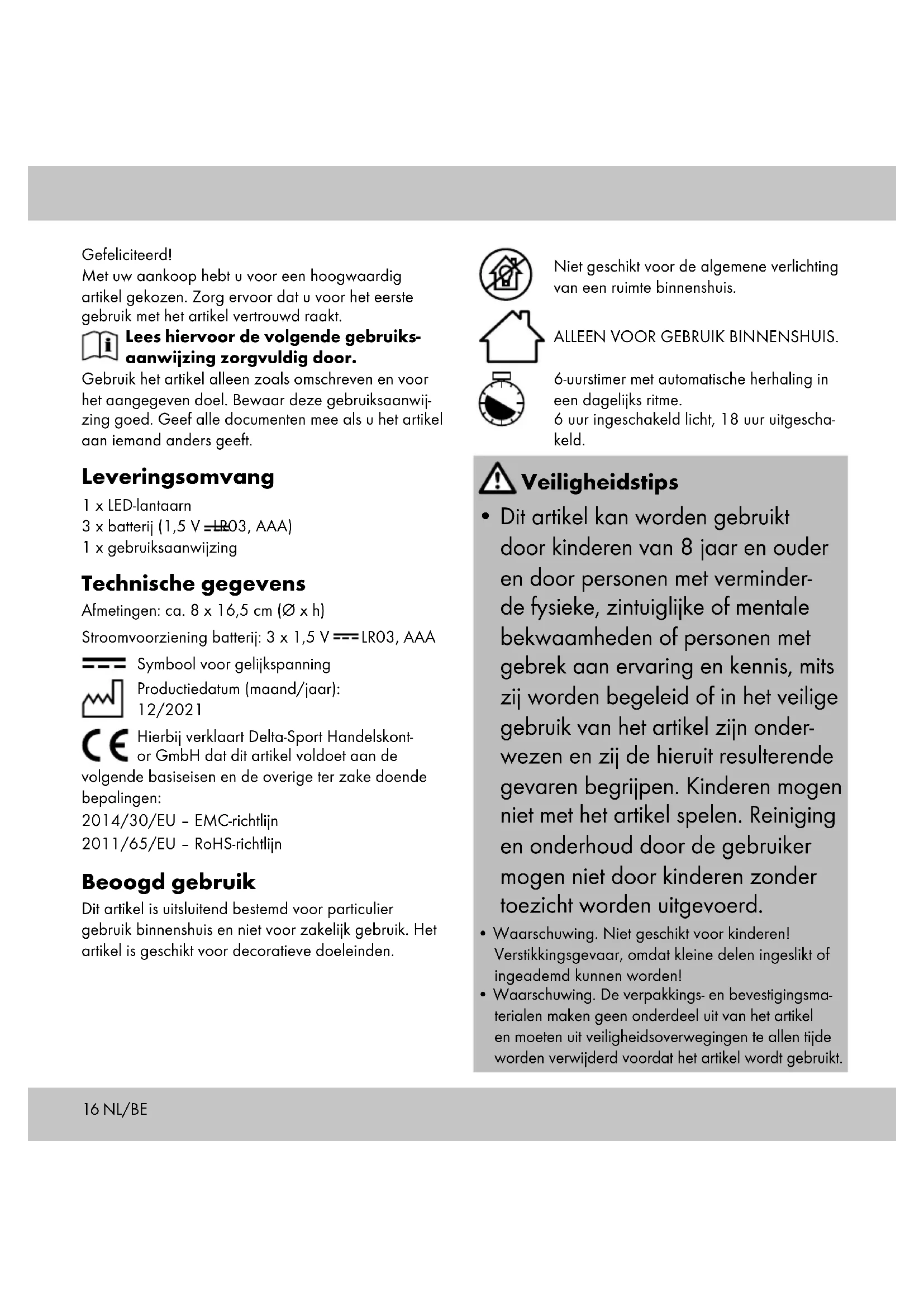 Batterijen wisselen Indien de batterijen niet meer werken, kunt u deze vervangen. Ga hiervoor te werk zoals omschreven in het gedeelte “Batterijen plaatsen”. Verwijder de oude batterijen uit het batterijvak voordat de nieuwe batterijen worden geplaatst. Licht in- en uitschakelen (afb. A) Schuif de schakelaar (1c) naar ‚ON‘ om het artikel (1) in te schakelen. Schuif de schakelaar (1c) naar ‚OFF‘ om het artikel uit te schakelen. Schuif de scha- kelaar (1c) naar ‚TIMER‘ om de timerfunctie van het artikel te activeren. Aanwijzing: bij de timerfunctie is het licht steeds 6 uur ingeschakeld en 18 uur uitgeschakeld. NL/BE18 Gebruik Het artikel kan binnenshuis worden opgesteld of opgehangen. Aanwijzing: plaats het artikel niet op kwetsbare oppervlakken. Dit kan tot krassen leiden. Houd rekening met het gewicht van het artikel als u het ophangt. Opslag, reiniging Bewaar het artikel wanneer u dit niet gebruikt altijd droog, schoon en zonder batterijen op kamertemperatuur. Reinig het artikel alleen met een vochtige schoon- maakdoek en droog het vervolgens af. BELANGRIJK! Reinig nooit met agressieve reinigings- middelen. Afvalverwerking Gooi uw afgedankte artikel ter bescherming van het milieu niet bij het huisafval, maar breng het naar een erkende afvalinzamelaar. U kunt bij uw gemeente informeren naar inzamelpun- ten en hun openingstijden. Defecte of lege batterijen/accu’s moeten conform richtlijn 2006/66/EG en wijzigingen ervan worden gerecycled. Geef batterijen/accu’s en/of het artikel terug via de aangeboden inzamelvoorzieningen. Geef verpakkingsmaterialen zoals foliezakjes niet aan kinderen. Berg het verpakkingsmateriaal buiten bereik van kinderen op. Milieuschade door verkeerde afvoer van batterijen/accu’s! Batterijen/accu’s mogen niet via het huisafval worden afgevoerd. Ze kunnen giftige zware metalen bevatten en moeten worden behandeld als klein chemisch afval. De chemische symbolen van de zware metalen zijn als volgt: Cd = cadmium, Hg = kwik, Pb = lood. Geef verbruikte batterijen/accu’s daarom af bij een gemeentelijk inzamelpunt. Voer het artikel en de verpakking op een milieuvriendelijke manier af. Neem de markering van verpakkingsmaterialen voor de afvalscheiding in acht. Deze zijn gemarkeerd met afkortingen (a) en nummers (b) met de volgende betekenis: 1 - 7: kunststoffen/20 - 22: papier en karton/80 - 98: composietmaterialen. Het artikel en de verpakkingsmaterialen zijn recycle- baar; voer ze gescheiden af voor een betere afvalbe- handeling. Het Triman-logo is alleen van toepassing voor Frankrijk. Informatie over de mogelijkheden om het afgedankte artikel af te voeren, wordt verstrekt door de gemeentelijke overheid. Opmerkingen over garantie en serviceafhandeling Het artikel werd met de grootste zorgvuldigheid en onder permanent toezicht geproduceerd. De firma DELTA-SPORT HANDELSKONTOR GmbH verleent particuliere eindklanten op dit artikel drie jaar garan- tie, te rekenen vanaf de datum van aankoop (garantie- termijn) en dit op grond van de volgende bepalingen. De garantie geldt alleen voor materiaal- en verwer- kingsfouten. De garantie is niet van toepassing op on- derdelen die aan een normale slijtage onderhevig zijn en daarom als niet-slijtvaste onderdelen te beschou- wen zijn (bv. batterijen) en evenmin op breekbare onderdelen, bv. schakelaars, accu’s of onderdelen die van glas gemaakt zijn. Uit de garantie voortvloeiende claims zijn uitgesloten als het artikel onvakkundig, verkeerd of niet in het kader van de voorziene bepaling of in het kader van het voorziene gebruiksdoeleinde gebruikt werd of indien richtlijnen in de gebruiksaanwijzing niet in acht genomen werden, tenzij de eindklant aantoont dat er sprake is van een materiaal- of verwerkingsfout die niet op één van de hoger vermelde omstandigheden gebaseerd is. NL/BE19 Uit de garantie voortvloeiende claims kunnen alleen tijdens de garantieperiode op vertoon van de originele kassabon ingediend worden. Gelieve daarom de origi- nele kassabon te bewaren. De garantieperiode wordt door eventuele reparaties op grond van de garantie, wettelijke waarborg of coulance niet verlengd. Dit geldt ook voor vervangen en gerepareerde onderdelen. Gelieve u bij klachten in eerste instantie tot de hieronder vermelde servicehotline te richten of met ons per e-mail contact op te nemen. Is er sprake van een garantiege- val, dan wordt het artikel door ons – naar onze keuze – voor u gratis gerepareerd, wordt het vervangen of wordt de aankoopsom terugbetaald. Verdere rechten op grond van de garantie bestaan niet. Uw wettelijke rechten, in het bijzonder rechten op garantie tegenover de betreffende verkoper, worden door deze garantie niet beperkt. IAN: 398633_2107 Service België Tel.: 070 270 171 (0,15 EUR/Min.) E-Mail: deltasport@lidl.be Service Nederland Tel.: 0900 0400223 (0,10 EUR/Min.) E-Mail: deltasport@lidl.nl NL/BE20 PL Gratulujemy! Decydując się na ten produkt, otrzymują Państwo to- war wysokiej jakości. Należy zapoznać się z produk- tem przed jego pierwszym użyciem. Należy uważnie przeczytać następują- cą instrukcję użytkowania. Produkt ten należy użytkować wyłącznie w opisany sposób oraz zgodnie ze wskazanym przeznaczeniem. Niniejszą instrukcję użytkowania należy przechowy- wać w bezpiecznym miejscu. Przekazując produkt in- nej osobie, należy upewnić się, że otrzyma ona także całą dokumentację dotyczącą produktu. Zakres dostawy 1 x latarnia LED 3 x bateria (1,5 V LR03, AAA) 1 x instrukcja użytkowania Dane techniczne Wymiary: ok. 8 x 16,5 cm (Ø x wys.) Zasilanie bateriami: 3 x 1,5 V LR03, AAA Symbol napięcia stałego Data produkcji (miesiąc/rok): 12/2021 Firma Delta-Sport Handelskontor GmbH oświadcza, że niniejszy produkt spełnia najważniejsze wymagania oraz jest zgodny z poda- nymi poniżej wytycznymi: 2014/30/UE – dyrektywa EMC 2011/65/UE – dyrektywa RoHS Użytkowanie zgodne z przeznaczeniem Ten produkt jest przeznaczony wyłącznie do prywat- nego użytku w p