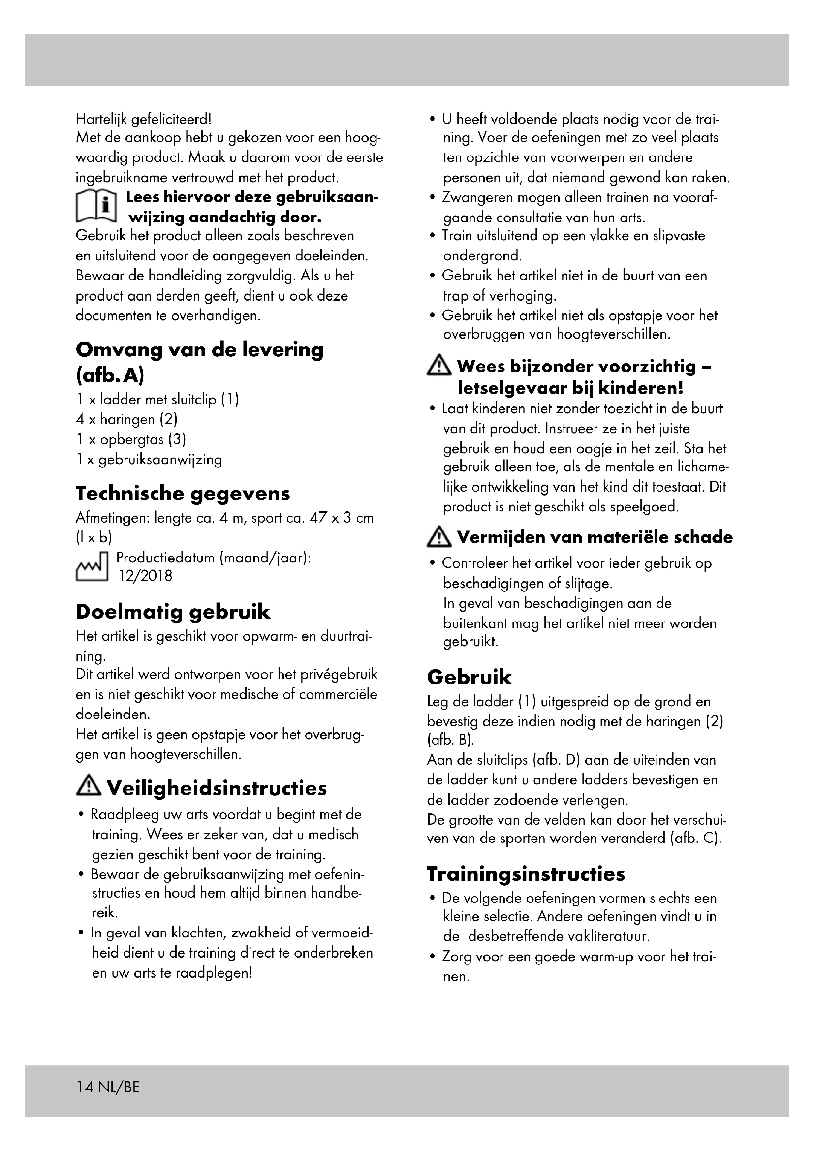 - Zorg voor een goede warm-up voor het trai- nen. Hartelijk gefeliciteerd! Met de aankoop hebt u gekozen voor een hoog- waardig product. Maak u daarom voor de eerste ingebruikname vertrouwd met het product. Lees hiervoor deze gebruiksaan- wijzing aandachtig door. Gebruik het product alleen zoals beschreven en uitsluitend voor de aangegeven doeleinden. Bewaar de handleiding zorgvuldig. Als u het product aan derden geeft, dient u ook deze documenten te overhandigen. Omvang van de levering (afb. A) 1 x ladder met sluitclip (1) 4 x haringen (2) 1 x opbergtas (3) 1 x gebruiksaanwijzing Technische gegevens Afmetingen: lengte ca. 4 m, sport ca. 47 x 3 cm (l x b) Productiedatum (maand/jaar): 12/2018 Doelmatig gebruik Het artikel is geschikt voor opwarm- en duurtrai- ning. Dit artikel werd ontworpen voor het privégebruik en is niet geschikt voor medische of commerciële doeleinden. Het artikel is geen opstapje voor het overbrug- gen van hoogteverschillen. Veiligheidsinstructies
