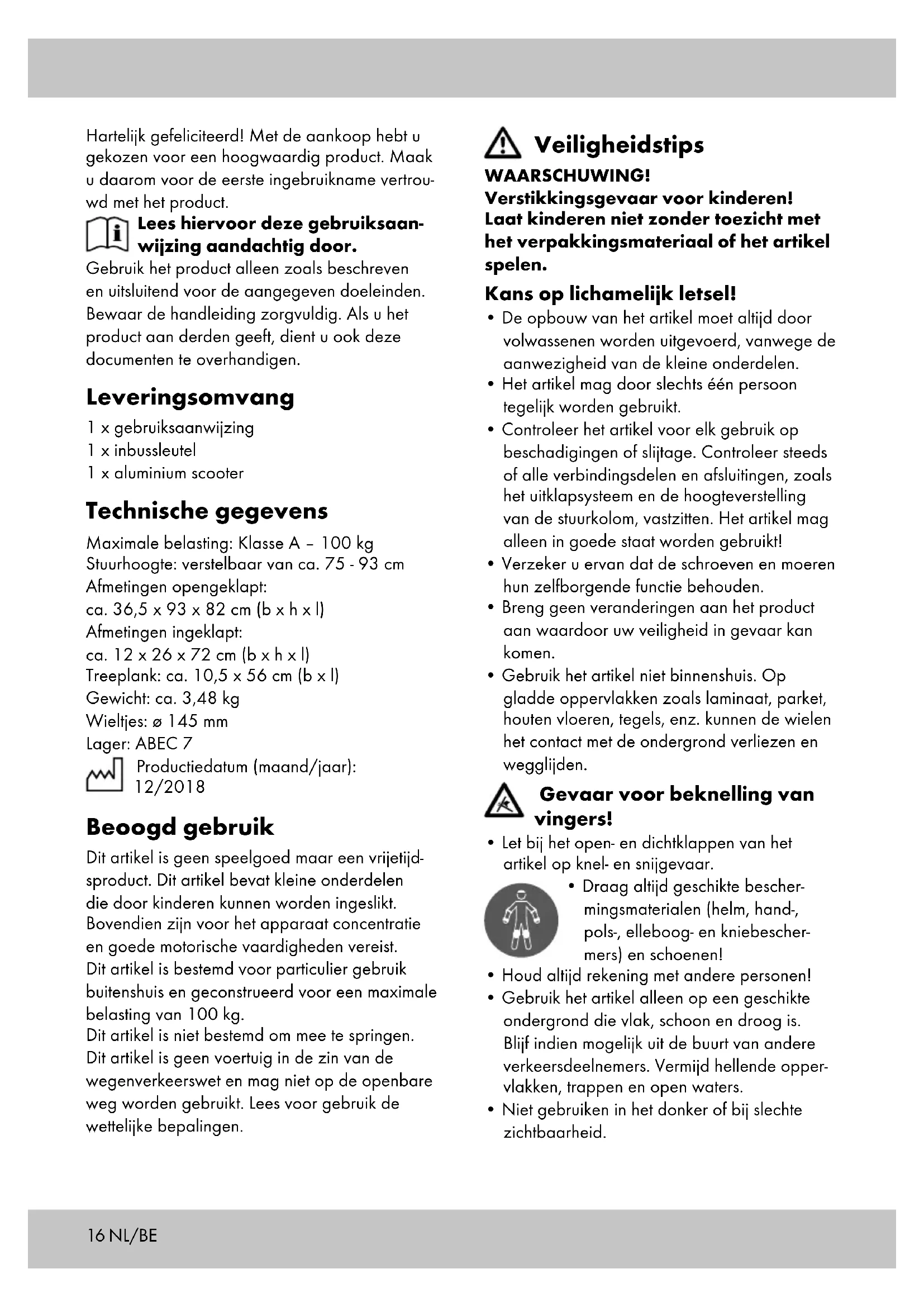 - Controleer het artikel voor elk gebruik op beschadigingen of slijtage. Controleer steeds of alle verbindingsdelen en afsluitingen, zoals het uitklapsysteem en de hoogteverstelling van de stuurkolom, vastzitten. Het artikel mag alleen in goede staat worden gebruikt!
