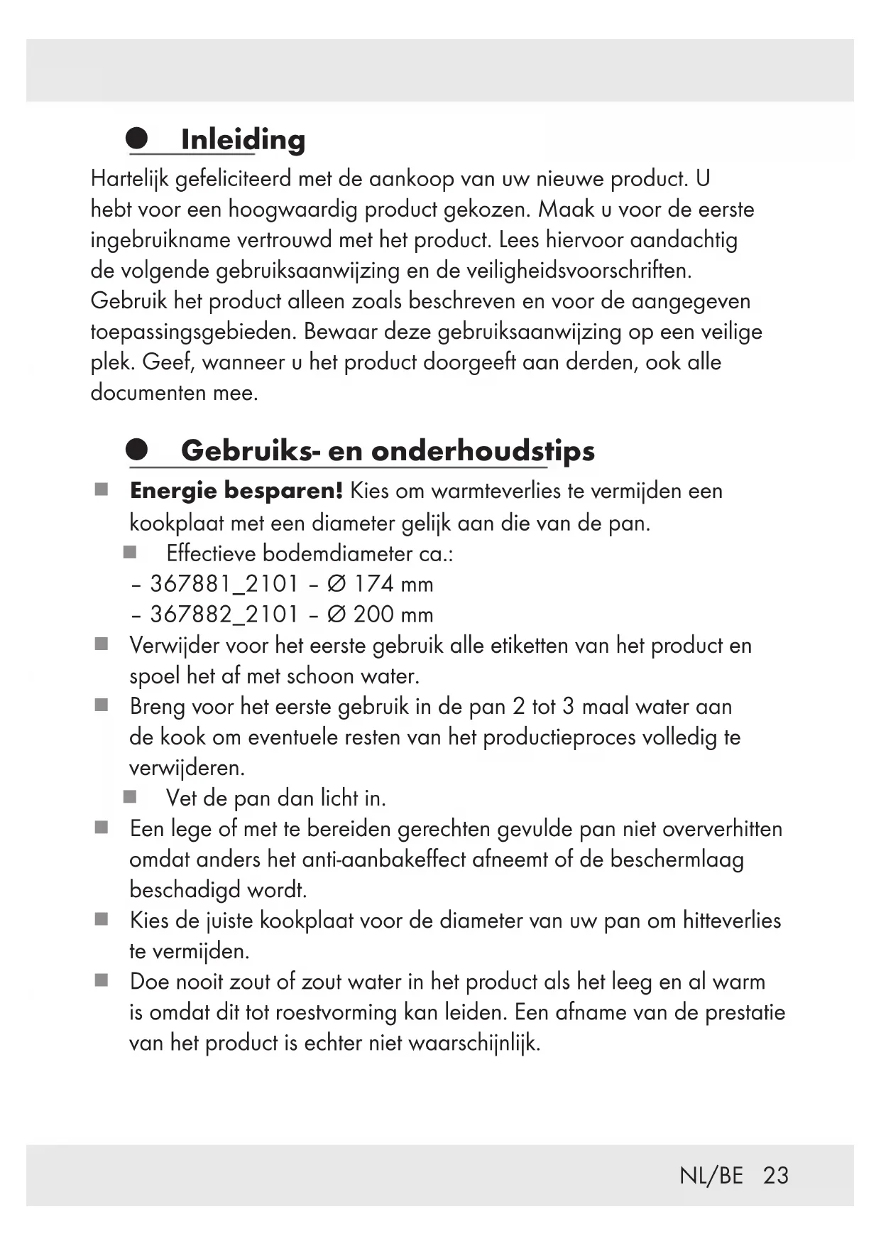 - s‘il présente les qualités qu‘un acheteur peut légitimement attendre eu égard aux déclarations publiques faites par le vendeur, par le producteur ou par son représentant, notamment dans la publicité ou l‘étiquetage ; 2° Ou s‘il présente les caractéristiques définies d‘un commun accord par les parties ou être propre à tout usage spécial recherché par l‘acheteur, porté à la connaissance du vendeur et que ce dernier a accepté. Article L217-12 du Code de la consommation L‘action résultant du défaut de conformité se prescrit par deux ans à compter de la délivrance du bien. Article 1641 du Code civil Le vendeur est tenu de la garantie à raison des défauts cachés de la chose vendue qui la rendent impropre à l‘usage auquel on la destine, ou qui diminuent tellement cet usage que l‘acheteur ne l‘aurait pas acquise, ou n‘en aurait donné qu‘un moindre prix, s‘il les avait connus. Article 1648 1er alinéa du Code civil L‘action résultant des vices rédhibitoires doit être intentée par l‘acquéreur dans un délai de deux ans à compter de la découverte du vice. Les pièces détachées indispensables à l’utilisation du produit sont disponibles pendant la durée de la garantie du produit.21FR/BE Le produit a été fabriqué selon des critères de qualité stricts et contrôlé consciencieusement avant sa livraison. En cas de défaillance, vous êtes en droit de retourner ce produit au vendeur. La présente garantie ne constitue pas une restriction de vos droits légaux. Ce produit bénéficie d‘une garantie de 3 ans à compter de sa date d’achat. La durée de garantie débute à la date d’achat. Veuillez conserver le ticket de caisse original. Il fera office de preuve d’achat. Si un problème matériel ou de fabrication devait survenir dans 3 ans suivant la date d‘achat de ce produit, nous assurons à notre discrétion la réparation ou le remplacement du produit sans frais supplémentaires. La garantie prend fin si le produit est endommagé suite à une utilisation inappropriée ou à un entretien défaillant. La garantie couvre les vices matériels et de fabrication. Cette garantie ne s’étend ni aux pièces du produit soumises à une usure normale (p. ex. des piles) et qui, par conséquent, peuvent être considérées comme des pièces d’usure, ni aux dommages sur des composants fragiles, comme des interrupteurs, des batteries ou des éléments fabriqués en verre.22 FR/BE Faire valoir sa garantie Pour garantir la rapidité d’exécution de la procédure de garantie, veuillez respecter les indications suivantes : Veuillez conserver le ticket de caisse et la référence du produit (par ex. IAN 123456_7890) à titre de preuve d’achat pour toute demande. Le numéro de référence de l’article est indiqué sur la plaque d’identification, gravé sur la page de titre de votre manuel (en bas à gauche) ou sur un autocollant apposé sur la face arrière ou inférieure du produit. En cas de dysfonctionnement du produit, ou de tout autre défaut, contactez en premier lieu le service après-vente par téléphone ou par e-mail aux coordonnées indiquées ci-dessous. Vous pouvez alors envoyer franco de port tout produit considéré comme défectueux au service clientèle indiqué, accompagné de la preuve d’achat (ticket de caisse) et d’une description écrite du défaut avec mention de sa date d’apparition. Service après-vente Service après-vente France Tél.: 0800904879 E-Mail: owim@lidl.fr Service après-vente Belgique Tél.: 080071011 Tél.: 80023970 (Luxembourg) E-Mail: owim@lidl.be23 NL/BE Inleiding Hartelijk gefeliciteerd met de aankoop van uw nieuwe product. U hebt voor een hoogwaardig product gekozen. Maak u voor de eerste ingebruikname vertrouwd met het product. Lees hiervoor aandachtig de volgende gebruiksaanwijzing en de veiligheidsvoorschriften. Gebruik het product alleen zoals beschreven en voor de aangegeven toepassingsgebieden. Bewaar deze gebruiksaanwijzing op een veilige plek. Geef, wanneer u het product doorgeeft aan derden, ook alle documenten mee. Gebruiks- en onderhoudstips Energie besparen! Kies om warmteverlies te vermijden een kookplaat met een diameter gelijk aan die van de pan. Effectieve bodemdiameter ca.: – 367881_2101–Ø174mm – 367882_2101–Ø200mm Verwijder voor het eerste gebruik alle etiketten van het product en spoel het af met schoon water. Breng voor het eerste gebruik in de pan 2tot3maal water aan de kook om eventuele resten van het productieproces volledig te verwijderen. Vet de pan dan licht in. Een lege of met te bereiden gerechten gevulde pan niet oververhitten omdat anders het anti-aanbakeffect afneemt of de beschermlaag beschadigd wordt. Kies de juiste kookplaat voor de diameter van uw pan om hitteverlies te vermijden. Doe nooit zout of zout water in het product als het leeg en al warm is omdat dit tot roestvorming kan leiden. Een afname van de prestatie van het product is echter niet waarschijnlijk.24 NL/BE Oververhittingsgevaar! Bij niet ingevette, oververhitte pannen kan contact met vetvrije levensmiddelen door verbranding van de eiwitten leiden tot verkleuring van de anti-aanbaklaag. Deze verkleuringen moeten gezien worden als gebruikssporen en zijn niet van invloed op de kwaliteit van de anti-aanbaklaag en de gebruiksgeschiktheid ervan. Verwarm de te bereiden gerechten op een hoge/gemiddelde verwarmingsstand en laat daarna alles op lage stand garen. Houd de pan altijd in het oog als vet verhit wordt: Oververhit vet kan ontbranden. Brandend vet nooit met water blussen! Verstik de vlammen met een deksel of een dikke wollen deken. Gebruik alleen keukengerei van hout of kunststof om de anti- aanbaklaag niet te beschadigen. Snijd de gerechten niet rechtstreeks in de pan. Geen druppelnat vlees in de pan doen. Het op een gloeiende kookplaat spattend vet kan gemakkelijk brand veroorzaken. Tijdens het koken kan de greep heet worden. Gebruik voor uw eigen bescherming een pa