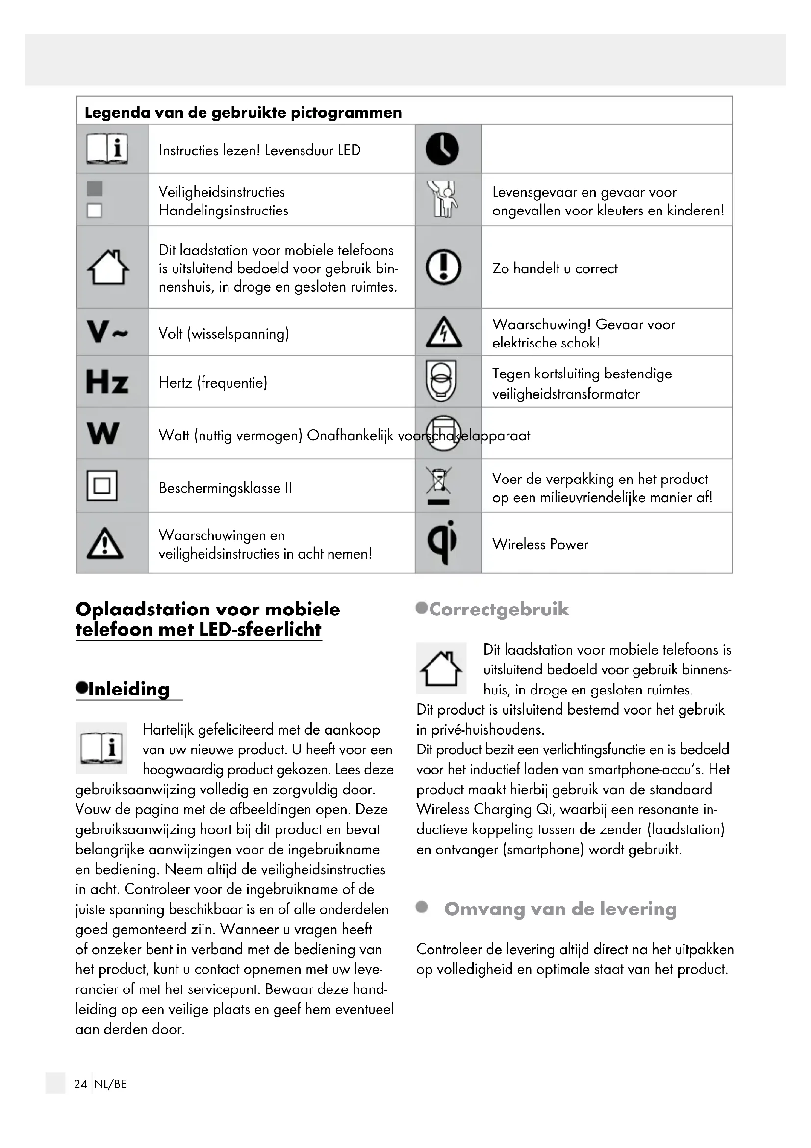 Si le dommage n'est pas couvert par la garantie : Renvoyez-nous l'article non réparé en supportant les frais de transports existants. Veuillez nous communiquer le montant de ces frais. Faites réparer l'article contre facturation.23 NL/BE Legenda van de gebruikte pictogrammen ..................................................... Pagina 24 Inleiding ....................................................................................................................................... Pagina 24 Correct gebruik ............................................................................................................................... Pagina 24 Omvang van de levering ................................................................................................................ Pagina 24 Beschrijving van de onderdelen ..................................................................................................... Pagina 25 Technische gegevens ...................................................................................................................... Pagina 25 Veiligheid .................................................................................................................................... Pagina 25 Veiligheidsinstructies ....................................................................................................................... Pagina 25 Ingebruikname ...................................................................................................................... Pagina 26 Sfeerlicht dimmen ............................................................................................................................ Pagina 26 RGB-kleuren bepalen ...................................................................................................................... Pagina 26 Accu van uw smartphone opladen ................................................................................................ Pagina 26 Hoes voor het mobieltje gebruiken ................................................................................................ Pagina 27 Onderhoud en reiniging ................................................................................................. Pagina 27 Afvoer ............................................................................................................................................ Pagina 27 Verklaring van overeenstemming ........................................................................ Pagina 27 Garantie / Service ................................................................................................................. Pagina 27 Garantie .......................................................................................................................................... Pagina 27 Serviceadres .................................................................................................................................... Pagina 28 Garantiekaart .................................................................................................................................. Pagina 28 InhoudsopgaveGarantie / Service24 NL/BE Inleiding / Veiligheid Inleiding Legenda van de gebruikte pictogrammen Instructies lezen! Levensduur LED Veiligheidsinstructies Handelingsinstructies Levensgevaar en gevaar voor ongevallen voor kleuters en kinderen! Dit laadstation voor mobiele telefoons is uitsluitend bedoeld voor gebruik bin- nenshuis, in droge en gesloten ruimtes. Zo handelt u correct Volt (wisselspanning) Waarschuwing! Gevaar voor elektrische schok! Hertz (frequentie) Tegen kortsluiting bestendige veiligheidstransformator Watt (nuttig vermogen) Onafhankelijk voorschakelapparaat Beschermingsklasse II Voer de verpakking en het product op een milieuvriendelijke manier af! Waarschuwingen en veiligheidsinstructies in acht nemen! Wireless Power Oplaadstation voor mobiele telefoon met LED-sfeerlicht Inleiding Hartelijk gefeliciteerd met de aankoop van uw nieuwe product. U heeft voor een hoogwaardig product gekozen. Lees deze gebruiksaanwijzing volledig en zorgvuldig door. Vouw de pagina met de afbeeldingen open. Deze gebruiksaanwijzing hoort bij dit product en bevat belangrijke aanwijzingen voor de ingebruikname en bediening. Neem altijd de veiligheidsinstructies in acht. Controleer voor de ingebruikname of de juiste spanning beschikbaar is en of alle onderdelen goed gemonteerd zijn. Wanneer u vragen heeft of onzeker bent in verband met de bediening van het product, kunt u contact opnemen met uw leve- rancier of met het servicepunt. Bewaar deze hand- leiding op een veilige plaats en geef hem eventueel aan derden door. Correct gebruik Dit laadstation voor mobiele telefoons is uitsluitend bedoeld voor gebruik binnens- huis, in droge en gesloten ruimtes. Dit product is uitsluitend bestemd voor het gebruik in privé-huishoudens. Dit product bezit een verlichtingsfunctie en is bedoeld voor het inductief laden van smartphone-accu‘s. Het product maakt hierbij gebruik van de standaard Wireless Charging Qi, waarbij een resonante in- ductieve koppeling tussen de zender (laadstation) en ontvanger (smartphone) wordt gebruikt. Omvang van de levering Controleer de levering altijd direct na het uitpakken op volledigheid en optimale staat van het product.25 NL/BE Inleiding / Veiligheid Inleiding 1 oplaadstation voor mobiele telefoon met LED-sfeerlicht 1 transformator (model TY1200100E1mn) 2 QI-laadontvanger 1 gebruiksaanwijzing incl. garantiekaart Beschrijving van de onderdelen