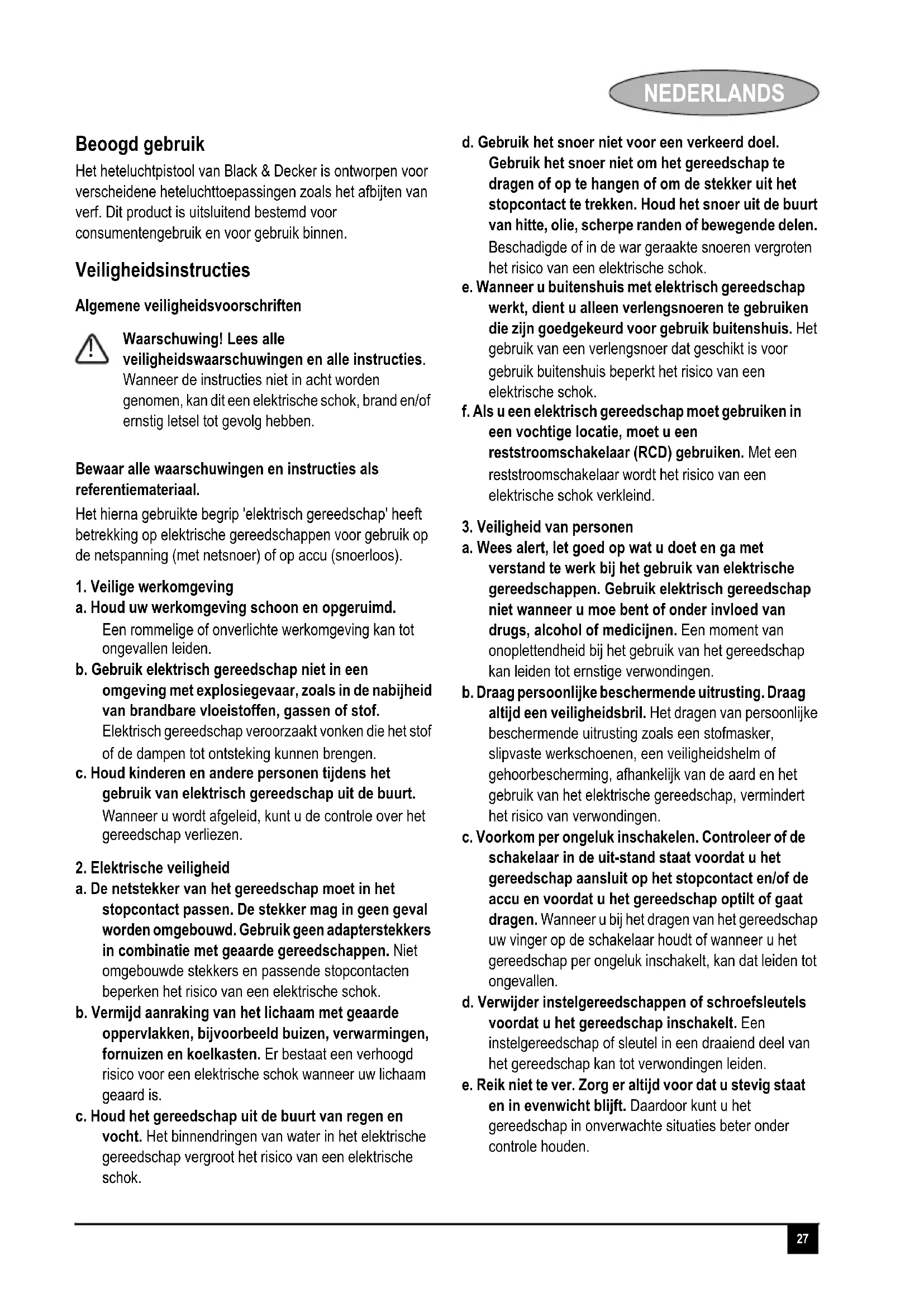 a. Laat het gereedschap alleen repareren door gekwalificeerd en vakkundig personeel en alleen met originele vervangingsonderdelen. Daarmee wordt de veiligheid van het gereedschap gewaarborgd. Aanvullende veiligheidswaarschuwingen Waarschuwing! Dit apparaat is niet bedoeld voor gebruik buiten, het mag uitsluitend binnen worden gebruikt. Waarschuwing! Dit apparaat mag niet worden gebruikt door personen (waaronder kinderen) die lichamelijk of geestelijk mindervalide zijn of die geen ervaring met of kennis van dit apparaat hebben, tenzij ze onder toezicht staan of instructies krijgen wat betreft het gebruik van het apparaat van een persoon die verantwoordelijk is voor hun veiligheid. Waarschuwing! Houd toezicht op kinderen om ervoor te zorgen dat zij niet met het apparaat gaan spelen. Waarschuwing! Dit apparaat moet op de standaard worden geplaatst wanneer het niet wordt gebruikt. Waarschuwing! Er kan brand ontstaan indien het apparaat niet met zorg wordt behandeld; wees daarom voorzichtig wanneer het apparaat wordt gebruikt op plaatsen waar zich ontvlambaar materiaal bevindt; X Zorg ervoor dat de hete lucht niet langdurig op dezelfde plek wordt toegepast; X Gebruik het apparaat niet op plaatsen waar ontploffingsgevaar dreigt; X Let erop dat de hete lucht niet wordt toegepast op brandbaar materiaal dat zich buiten zicht bevindt; X Plaats het apparaat na gebruik op de standaard zodat het kan afkoelen voordat het wordt opgeborgen. X Laat het apparaat niet onbeheerd achter wanneer het is ingeschakeld. X De luchtinlaatgleuven en de uitlaat van het mondstuk mogen niet worden geblokkeerd omdat daardoor een opeenhoping van hete lucht kan ontstaan hetgeen het apparaat kan beschadigen. X Richt de hete lucht niet op mensen of dieren. Waarschuwing! Aanvullende veiligheidsinstructies voor heteluchtpistolen. !29 NEDERLANDS X Het mondstuk mag niet worden aangeraakt omdat het tijdens gebruik zeer heet wordt en blijft tot 30 minuten na gebruik. X Plaats het mondstuk niet tijdens of onmiddellijk na gebruik tegen een voorwerp. X Steek geen voorwerp in het mondstuk omdat hierdoor de kans op een elektrische shock ontstaat. X Kijk niet in het mondstuk terwijl het apparaat is ingeschakeld. X Het apparaat mag niet als haardroger worden gebruikt! De luchttemperatuur is veel hoger dan die van een haardroger. X Zorg voor voldoende ventilatie tijdens het gebruik omdat er giftige gassen kunnen ontstaan. X Het apparaat mag niet in een vochtige ruimte worden gebruikt. X Wanneer u verf afbijt, zorg er dan voor dat het werkgebied is omsloten. Draag een stofmasker dat speciaal is gemaakt voor bescherming tegen stof van loodverf en gassen, en zorg ervoor dat personen die zich in het werkgebied bevinden of het werkgebied betreden tevens beschermd zijn. X De verf mag niet verbranden omdat hierdoor brand kan ontstaan. X Zorg ervoor dat verf niet aan het mondstuk blijft kleven omdat het na verloop van tijd kan ontvlammen. X Schakel het apparaat uit en laat het afkoelen voordat u er een (ander) hulpstuk op plaatst. Afbijten van loodverf X Uiterste voorzichtigheid dient te worden betracht tijdens het afbijten van verf. De schilfers, overblijfselen en dampen van de verf kunnen lood bevatten wat giftig is. Alle gebouwen van vóór 1960 kunnen in het verleden zijn geschilderd met loodverf. Het is mogelijk dat deze verf is bedekt met meerdere lagen verf. Zodra de verf aan de oppervlakte komt, kan contact tussen de hand en de mond leiden tot de inname van lood. X Ook blootstaan aan kleine hoeveelheden lood kan tot permanente beschadiging aan de hersenen en het zenuwstelsel leiden. Het grootste risico van loodvergiftiging bestaat voor kinderen en bij zwangerschap. X Voordat u met de werkzaamheden begint, is het van belang dat wordt vastgesteld of de verf die wordt afgebeten lood bevat. Dit kan worden gedaan door middel van onderzoekmateriaal of door een bevoegd schildersbedrijf. Zorg ervoor dat er niet wordt gerookt, gegeten of gedronken in een werkgebied waar zich lood bevindt of kan bevinden. Loodverf mag alleen door een daartoe bevoegd persoon worden verwijderd en mag niet met een heteluchtpistool worden verwijderd. Labels Elektrische veiligheid X Als het netsnoer is beschadigd, moet dit worden vervangen door de fabrikant of een Black & Decker- servicecentrum om gevaren te voorkomen. Verlengsnoeren X Twee- of drie-aderige snoeren mogen worden gebruikt omdat het apparaat dubbel geïsoleerd is en de uitvoering klasse II betreft. X U kunt een snoer van maximaal 30 m gebruiken zonder vermogensverlies. Onderdelen