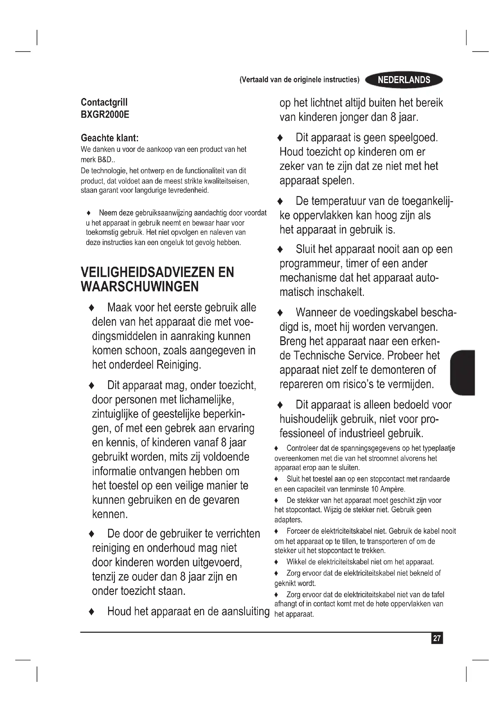 Contactgrill BXGR2000E Geachte klant: We danken u voor de aankoop van een product van het merk B&D.. De technologie, het ontwerp en de functionaliteit van dit product, dat voldoet aan de meest strikte kwaliteitseisen, staan garant voor langdurige tevredenheid. ♦ Neem deze gebruiksaanwijzing aandachtig door voordat u het apparaat in gebruik neemt en bewaar haar voor toekomstig gebruik. Het niet opvolgen en naleven van deze instructies kan een ongeluk tot gevolg hebben. VEILIGHEIDSADVIEZEN EN WAARSCHUWINGEN ♦ Maak voor het eerste gebruik alle delen van het apparaat die met voe- dingsmiddelen in aanraking kunnen komen schoon, zoals aangegeven in het onderdeel Reiniging. ♦ Dit apparaat mag, onder toezicht, door personen met lichamelijke, zintuiglijke of geestelijke beperkin- gen, of met een gebrek aan ervaring en kennis, of kinderen vanaf 8 jaar gebruikt worden, mits zij voldoende informatie ontvangen hebben om het toestel op een veilige manier te kunnen gebruiken en de gevaren kennen. ♦ De door de gebruiker te verrichten reiniging en onderhoud mag niet door kinderen worden uitgevoerd, tenzij ze ouder dan 8 jaar zijn en onder toezicht staan. ♦ Houd het apparaat en de aansluiting op het lichtnet altijd buiten het bereik van kinderen jonger dan 8 jaar. ♦ Dit apparaat is geen speelgoed. Houd toezicht op kinderen om er zeker van te zijn dat ze niet met het apparaat spelen. ♦ De temperatuur van de toegankelij- ke oppervlakken kan hoog zijn als het apparaat in gebruik is. ♦ Sluit het apparaat nooit aan op een programmeur, timer of een ander mechanisme dat het apparaat auto- matisch inschakelt. ♦ Wanneer de voedingskabel bescha- digd is, moet hij worden vervangen. Breng het apparaat naar een erken- de Technische Service. Probeer het apparaat niet zelf te demonteren of repareren om risico’s te vermijden. ♦ Dit apparaat is alleen bedoeld voor huishoudelijk gebruik, niet voor pro- fessioneel of industrieel gebruik. ♦ Controleer dat de spanningsgegevens op het typeplaatje overeenkomen met die van het stroomnet alvorens het apparaat erop aan te sluiten. ♦ Sluit het toestel aan op een stopcontact met randaarde en een capaciteit van tenminste 10 Ampère. ♦ De stekker van het apparaat moet geschikt zijn voor het stopcontact. Wijzig de stekker niet. Gebruik geen adapters. ♦ Forceer de elektriciteitskabel niet. Gebruik de kabel nooit om het apparaat op te tillen, te transporteren of om de stekker uit het stopcontact te trekken. ♦ Wikkel de elektriciteitskabel niet om het apparaat. ♦ Zorg ervoor dat de elektriciteitskabel niet bekneld of geknikt wordt. ♦ Zorg ervoor dat de elektriciteitskabel niet van de tafel afhangt of in contact komt met de hete oppervlakken van het apparaat.NEDERLANDS (Vertaald van de originele instructies)