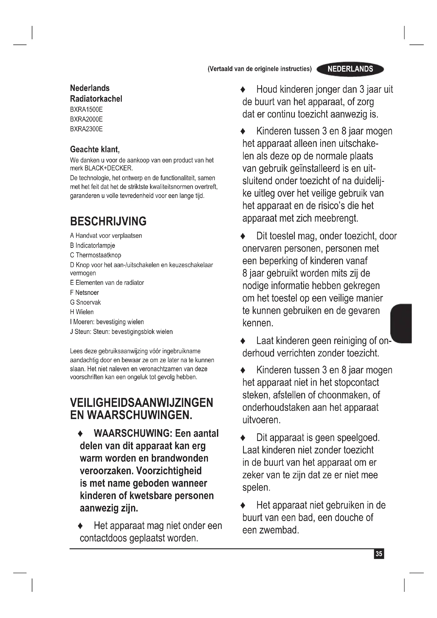 Nederlands Radiatorkachel BXRA1500E BXRA2000E BXRA2300E Geachte klant, We danken u voor de aankoop van een product van het merk BLACK+DECKER. De technologie, het ontwerp en de functionaliteit, samen met het feit dat het de striktste kwaliteitsnormen overtreft, garanderen u volle tevredenheid voor een lange tijd. BESCHRIJVING A Handvat voor verplaatsen B Indicatorlampje C Thermostaatknop D Knop voor het aan-/uitschakelen en keuzeschakelaar vermogen E Elementen van de radiator F Netsnoer G Snoervak H Wielen I Moeren: bevestiging wielen J Steun: Steun: bevestigingsblok wielen Lees deze gebruiksaanwijzing vóór ingebruikname aandachtig door en bewaar ze om ze later na te kunnen slaan. Het niet naleven en veronachtzamen van deze voorschriften kan een ongeluk tot gevolg hebben. VEILIGHEIDSAANWIJZINGEN EN WAARSCHUWINGEN. ♦ WAARSCHUWING: Een aantal delen van dit apparaat kan erg warm worden en brandwonden veroorzaken. Voorzichtigheid is met name geboden wanneer kinderen of kwetsbare personen aanwezig zijn. ♦ Het apparaat mag niet onder een contactdoos geplaatst worden. ♦ Houd kinderen jonger dan 3 jaar uit de buurt van het apparaat, of zorg dat er continu toezicht aanwezig is. ♦ Kinderen tussen 3 en 8 jaar mogen het apparaat alleen inen uitschake- len als deze op de normale plaats van gebruik geïnstalleerd is en uit- sluitend onder toezicht of na duidelij- ke uitleg over het veilige gebruik van het apparaat en de risico’s die het apparaat met zich meebrengt. ♦ Dit toestel mag, onder toezicht, door onervaren personen, personen met een beperking of kinderen vanaf 8 jaar gebruikt worden mits zij de nodige informatie hebben gekregen om het toestel op een veilige manier te kunnen gebruiken en de gevaren kennen. ♦ Laat kinderen geen reiniging of on- derhoud verrichten zonder toezicht. ♦ Kinderen tussen 3 en 8 jaar mogen het apparaat niet in het stopcontact steken, afstellen of choonmaken, of onderhoudstaken aan het apparaat uitvoeren. ♦ Dit apparaat is geen speelgoed. Laat kinderen niet zonder toezicht in de buurt van het apparaat om er zeker van te zijn dat ze er niet mee spelen. ♦ Het apparaat niet gebruiken in de buurt van een bad, een douche of een zwembad.NEDERLANDS (Vertaald van de originele instructies)