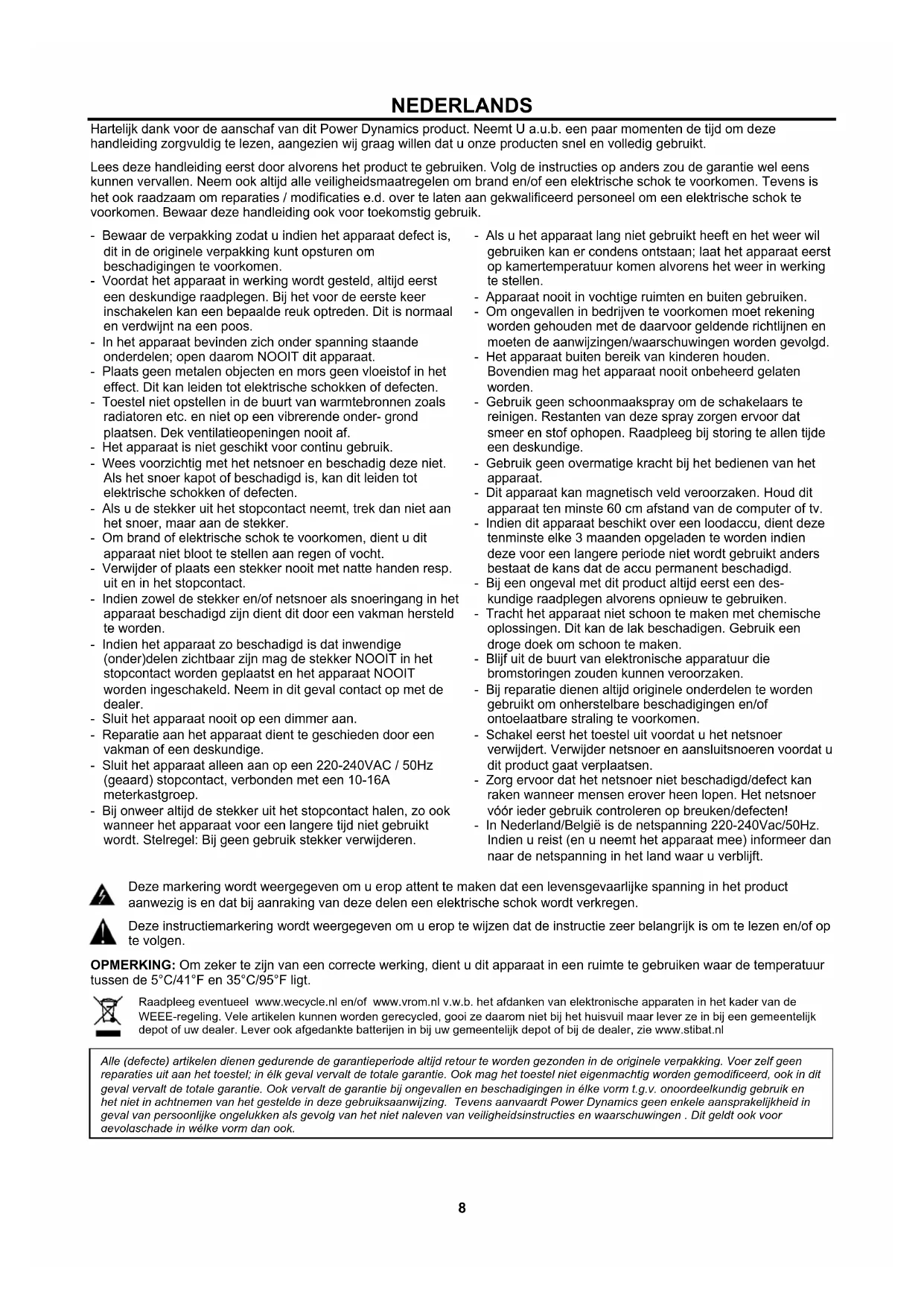 NEDERLANDS Hartelijk dank voor de aanschaf van dit Power Dynamics product. Neemt U a.u.b. een paar momenten de tijd om deze handleiding zorgvuldig te lezen, aangezien wij graag willen dat u onze producten snel en volledig gebruikt. Lees deze handleiding eerst door alvorens het product te gebruiken. Volg de instructies op anders zou de garantie wel eens kunnen vervallen. Neem ook altijd alle veiligheidsmaatregelen om brand en/of een elektrische schok te voorkomen. Tevens is het ook raadzaam om reparaties / modificaties e.d. over te laten aan gekwalificeerd personeel om een elektrische schok te voorkomen. Bewaar deze handleiding ook voor toekomstig gebruik. - Bewaar de verpakking zodat u indien het apparaat defect is, dit in de originele verpakking kunt opsturen om beschadigingen te voorkomen. - Voordat het apparaat in werking wordt gesteld, altijd eerst een deskundige raadplegen. Bij het voor de eerste keer inschakelen kan een bepaalde reuk optreden. Dit is normaal en verdwijnt na een poos. - In het apparaat bevinden zich onder spanning staande onderdelen; open daarom NOOIT dit apparaat. - Plaats geen metalen objecten en mors geen vloeistof in het effect. Dit kan leiden tot elektrische schokken of defecten. - Toestel niet opstellen in de buurt van warmtebronnen zoals radiatoren etc. en niet op een vibrerende onder- grond plaatsen. Dek ventilatieopeningen nooit af. - Het apparaat is niet geschikt voor continu gebruik. - Wees voorzichtig met het netsnoer en beschadig deze niet. Als het snoer kapot of beschadigd is, kan dit leiden tot elektrische schokken of defecten. - Als u de stekker uit het stopcontact neemt, trek dan niet aan het snoer, maar aan de stekker. - Om brand of elektrische schok te voorkomen, dient u dit apparaat niet bloot te stellen aan regen of vocht. - Verwijder of plaats een stekker nooit met natte handen resp. uit en in het stopcontact. - Indien zowel de stekker en/of netsnoer als snoeringang in het apparaat beschadigd zijn dient dit door een vakman hersteld te worden. - Indien het apparaat zo beschadigd is dat inwendige (onder)delen zichtbaar zijn mag de stekker NOOIT in het stopcontact worden geplaatst en het apparaat NOOIT worden ingeschakeld. Neem in dit geval contact op met de dealer. - Sluit het apparaat nooit op een dimmer aan. - Reparatie aan het apparaat dient te geschieden door een vakman of een deskundige. - Sluit het apparaat alleen aan op een 220-240VAC / 50Hz (geaard) stopcontact, verbonden met een 10-16A meterkastgroep. - Bij onweer altijd de stekker uit het stopcontact halen, zo ook wanneer het apparaat voor een langere tijd niet gebruikt wordt. Stelregel: Bij geen gebruik stekker verwijderen. - Als u het apparaat lang niet gebruikt heeft en het weer wil gebruiken kan er condens ontstaan; laat het apparaat eerst op kamertemperatuur komen alvorens het weer in werking te stellen. - Apparaat nooit in vochtige ruimten en buiten gebruiken. - Om ongevallen in bedrijven te voorkomen moet rekening worden gehouden met de daarvoor geldende richtlijnen en moeten de aanwijzingen/waarschuwingen worden gevolgd. - Het apparaat buiten bereik van kinderen houden. Bovendien mag het apparaat nooit onbeheerd gelaten worden. - Gebruik geen schoonmaakspray om de schakelaars te reinigen. Restanten van deze spray zorgen ervoor dat smeer en stof ophopen. Raadpleeg bij storing te allen tijde een deskundige. - Gebruik geen overmatige kracht bij het bedienen van het apparaat. - Dit apparaat kan magnetisch veld veroorzaken. Houd dit apparaat ten minste 60 cm afstand van de computer of tv. - Indien dit apparaat beschikt over een loodaccu, dient deze tenminste elke 3 maanden opgeladen te worden indien deze voor een langere periode niet wordt gebruikt anders bestaat de kans dat de accu permanent beschadigd. - Bij een ongeval met dit product altijd eerst een des- kundige raadplegen alvorens opnieuw te gebruiken. - Tracht het apparaat niet schoon te maken met chemische oplossingen. Dit kan de lak beschadigen. Gebruik een droge doek om schoon te maken. - Blijf uit de buurt van elektronische apparatuur die bromstoringen zouden kunnen veroorzaken. - Bij reparatie dienen altijd originele onderdelen te worden gebruikt om onherstelbare beschadigingen en/of ontoelaatbare straling te voorkomen. - Schakel eerst het toestel uit voordat u het netsnoer verwijdert. Verwijder netsnoer en aansluitsnoeren voordat u dit product gaat verplaatsen. - Zorg ervoor dat het netsnoer niet beschadigd/defect kan raken wanneer mensen erover heen lopen. Het netsnoer vóór ieder gebruik controleren op breuken/defecten! - In Nederland/België is de netspanning 220-240Vac/50Hz. Indien u reist (en u neemt het apparaat mee) informeer dan naar de netspanning in het land waar u verblijft.