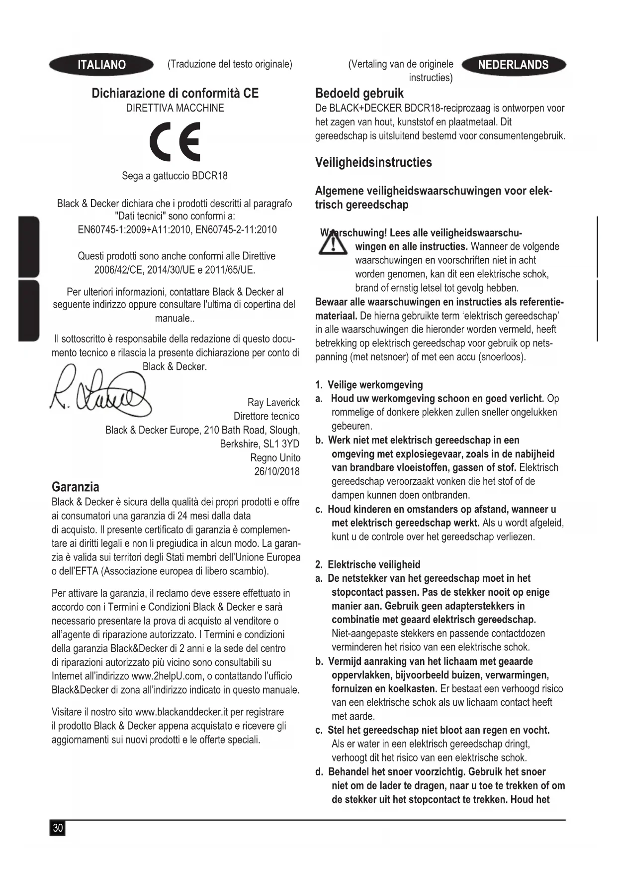 BDCR18 - Reciprozaag Black & Decker verklaart dat deze producten, die zijn beschre- ven bij 'Technische gegevens', voldoen aan: EN60745-1:2009+A11:2010, EN60745-2-11:2010 Deze producten voldoen tevens aan richtlijn 2006/42/EG, 2014/30/EU en 2011/65/EU. Neem voor meer informatie contact op met Black & Decker op het volgende adres of raadpleeg de achterzijde van de handleiding. Ondergetekende is verantwoordelijk voor de compilatie van het technische bestand en geeft deze verklaring namens Black & Decker af. Ray Laverick Director of Engineering Black & Decker Europe, 210 Bath Road, Slough, Berkshire, SL1 3YD Verenigd Koninkrijk 26/10/2018 Garantie Black & Decker heeft vertrouwen in zijn producten en biedt consumenten een garantie van 24 maanden vanaf de datum van aankoop. Deze garantie vormt een aanvulling op uw wettelijke rechten en beperken deze niet. De garantie is geldig op het grondgebied van de Lidstaten van de Europese Unie en de Europese Vrijhandelszone. Voor een garantie-aanspraak moet uw aanspraak in overeen- stemming zijn met de Voorwaarden en Condities van Black & Decker en moet u een bewijs van aankoop overleggen aan de verkoper of aan een geautoriseerde reparatiemon- teur. Voorwaarden en condities van de 2-jarige garantie van Black&Decker en het adres van de vestiging van het geau- toriseerde reparatiecentrum bij u in de buurt, kunt u vinden op internet op www.2helpU.com, of door contact op te nemen met het Black & Decker-kantoor ter plaatse, op het adres dat in deze handleiding wordt vermeld. Bezoek onze website www.blackanddecker.nl, waar u uw nieuwe Black & Decker-product kunt registreren en informatie kunt verkrijgen over nieuwe producten en speciale aanbied- ingen. Uso previsto La sierra de vaivén BLACK+DECKER BDCR18 se ha diseñado para serrar madera, plástico y planchas de metal. Esta herramienta está pensada únicamente para uso doméstico. Instrucciones de seguridad Advertencias de seguridad generales para herrami- entas eléctricas Advertencia. Lea todas las advertencias de seguridad y todas las instrucciones. En caso de no atenerse a las siguientes advertencias e instrucciones de seguridad, podría producirse una descarga eléctrica, incendio o lesión grave. Guarde todas las advertencias e instrucciones para futuras consultas. El término “herramienta eléctrica” em- pleado en las advertencias a continuación hace referencia a la herramienta eléctrica con alimentación de red (con cable) o alimentada por batería (sin cable).